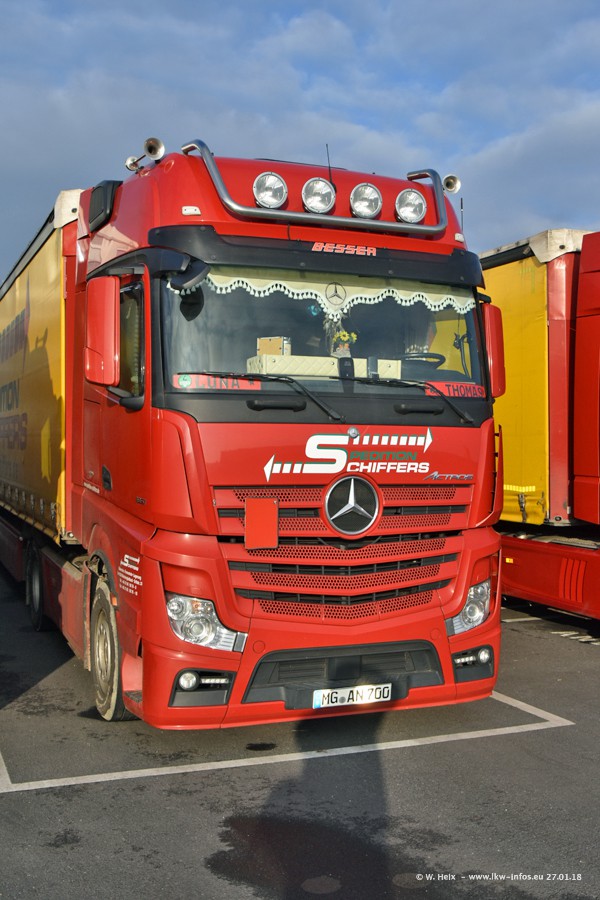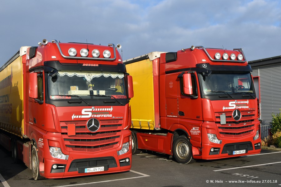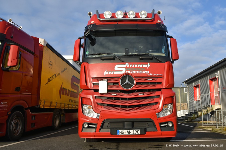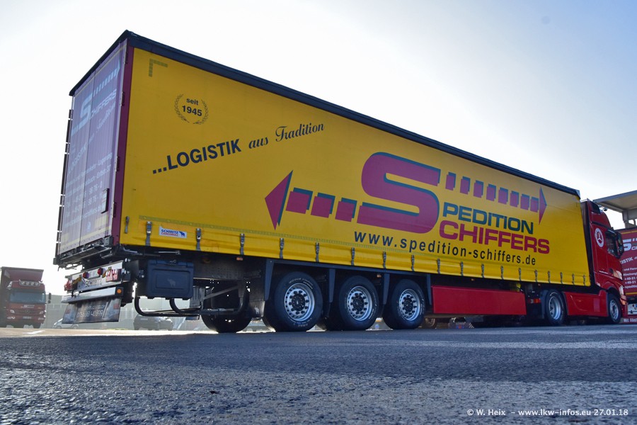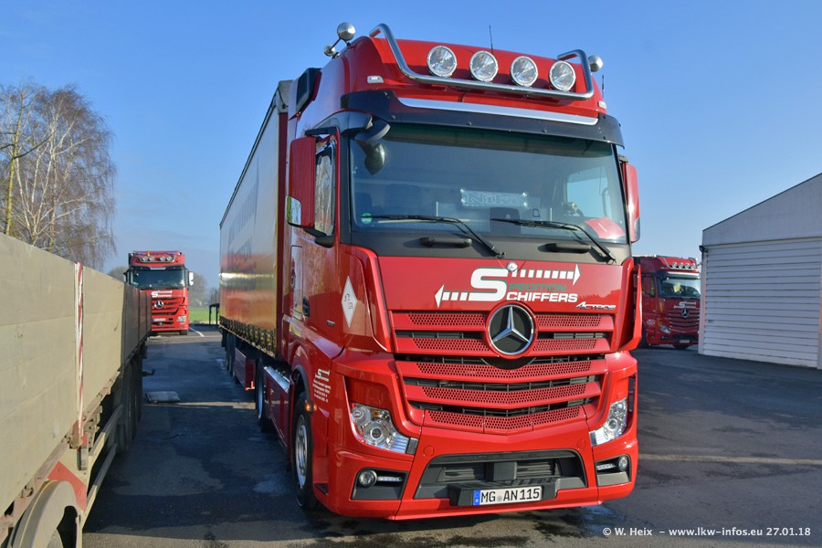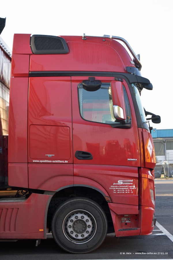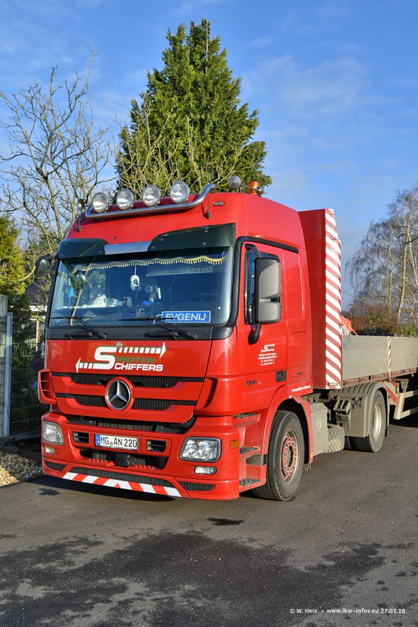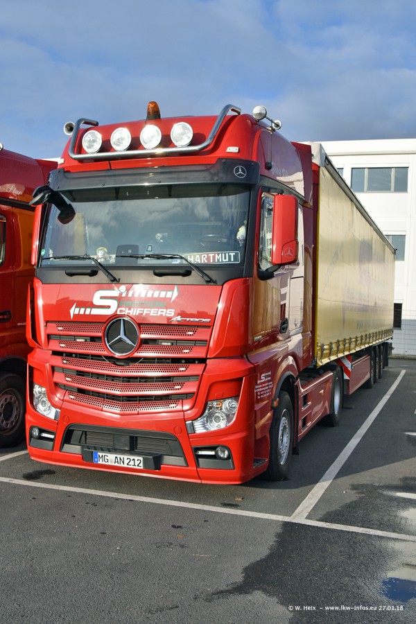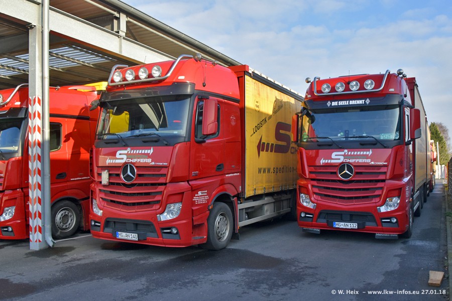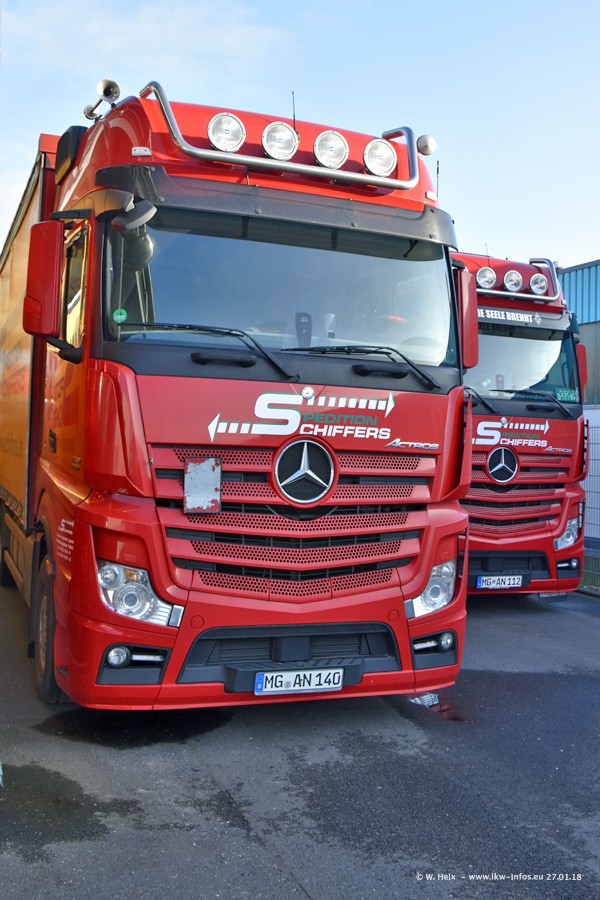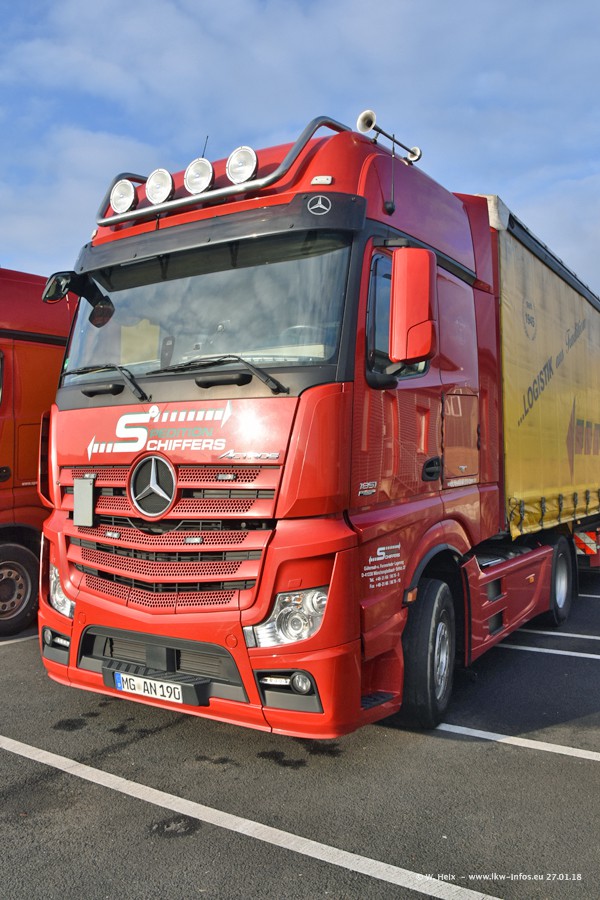 Heute war ich zum ersten Mal bei Schiffers in Mönchengladbach. Es gibt insgesamt 28 LKW, alle von Mercedes-Benz. Im Fernverkehr sind überwiegend Actros 4 im Einsatz. Im Nahverkehr werden überwiegend Mercedes-Benz der Baureihen Actros MP2 und Actros 3 eingesetzt.