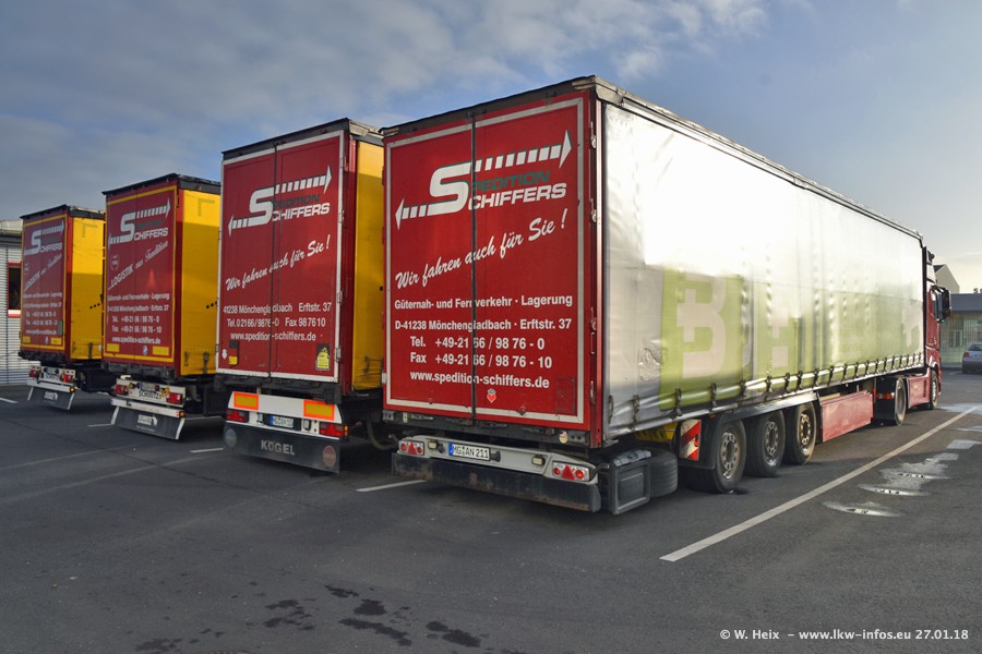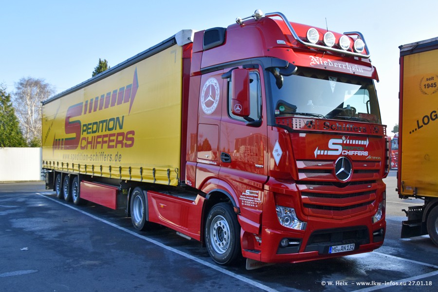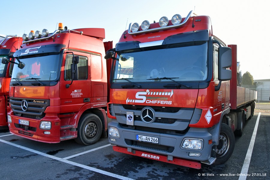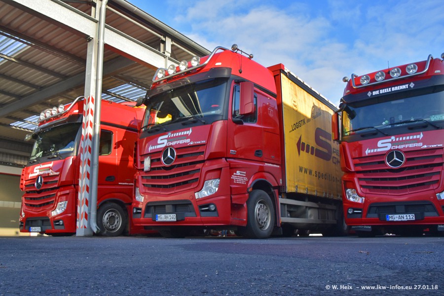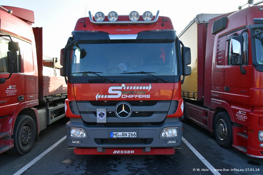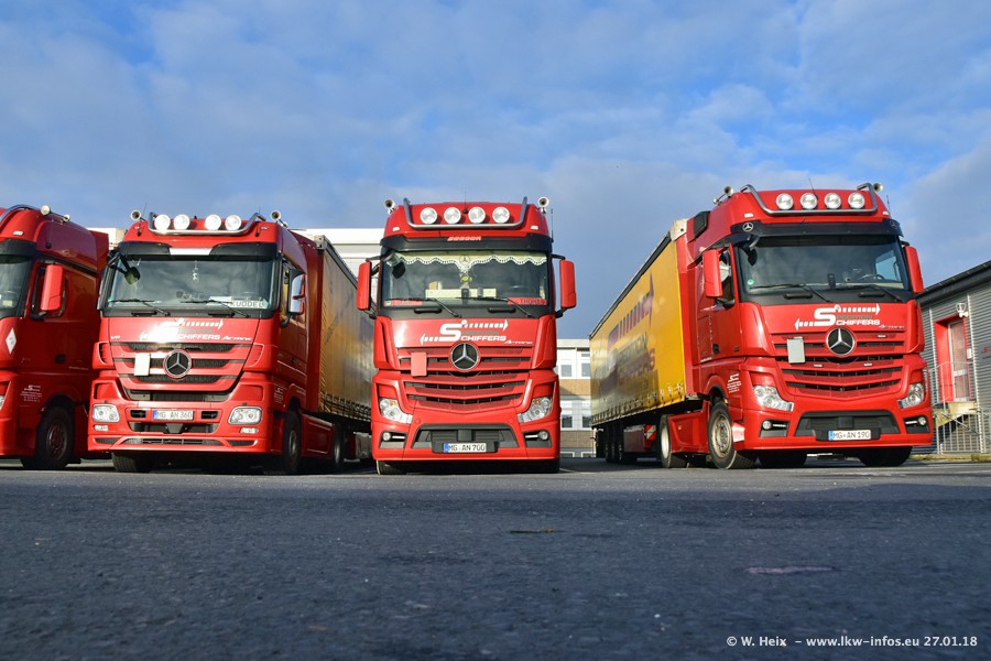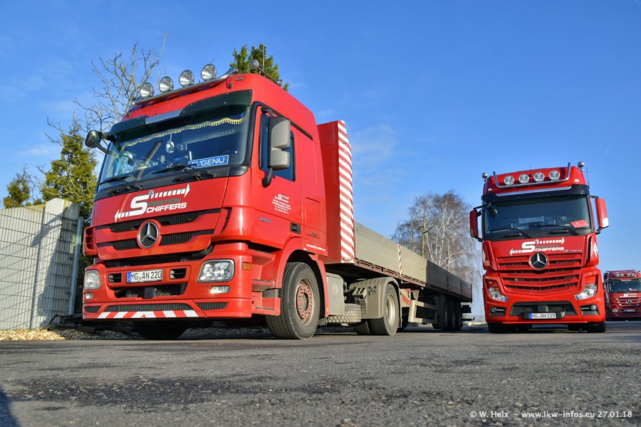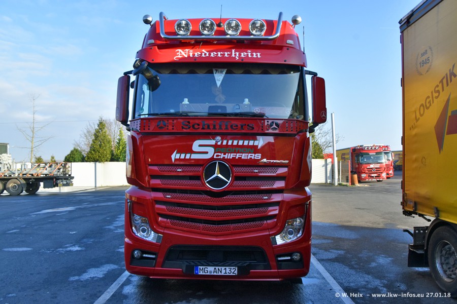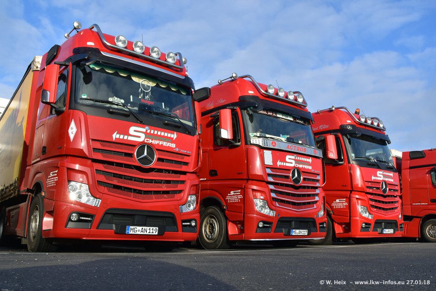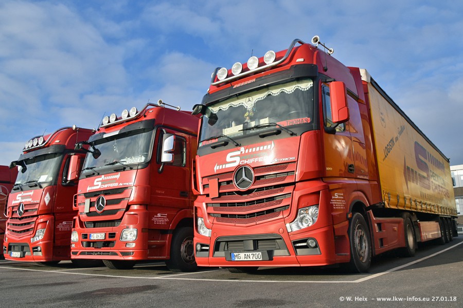 Heute war ich zum ersten Mal bei Schiffers in Mönchengladbach. Es gibt insgesamt 28 LKW, alle von Mercedes-Benz. Im Fernverkehr sind überwiegend Actros 4 im Einsatz. Im Nahverkehr werden überwiegend Mercedes-Benz der Baureihen Actros MP2 und Actros 3 eingesetzt.