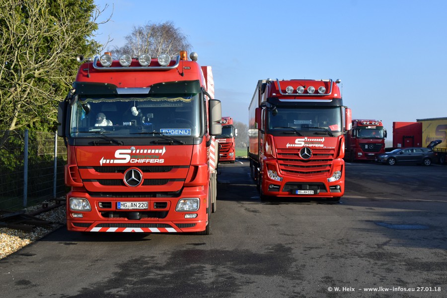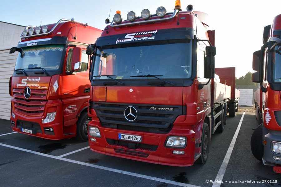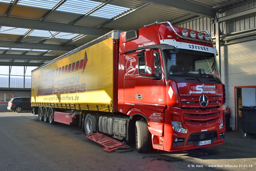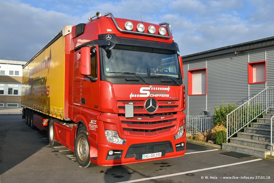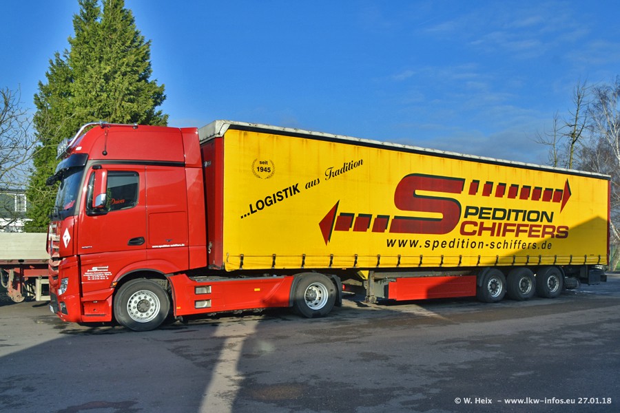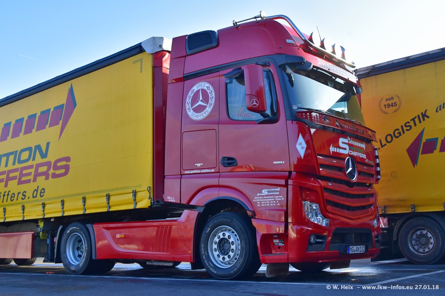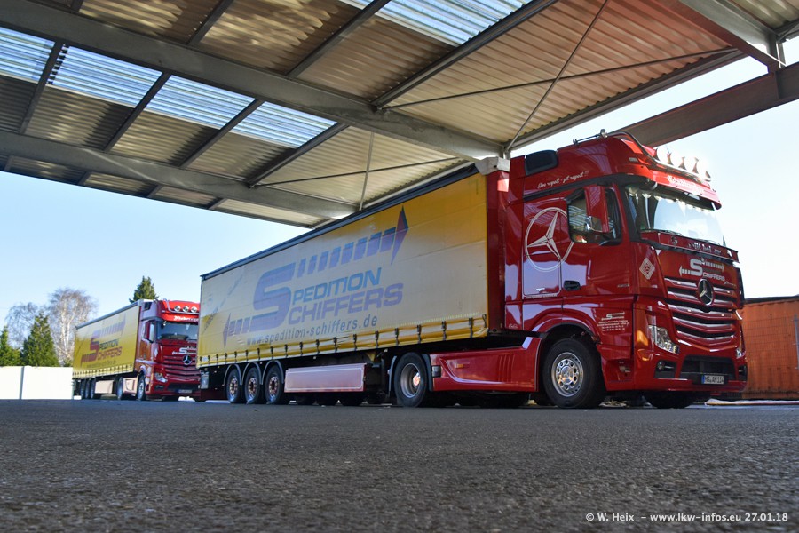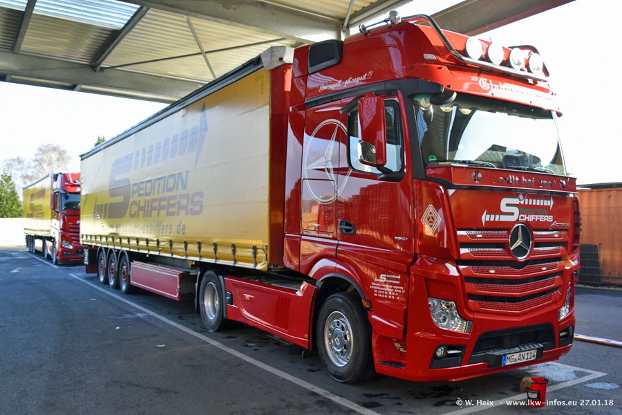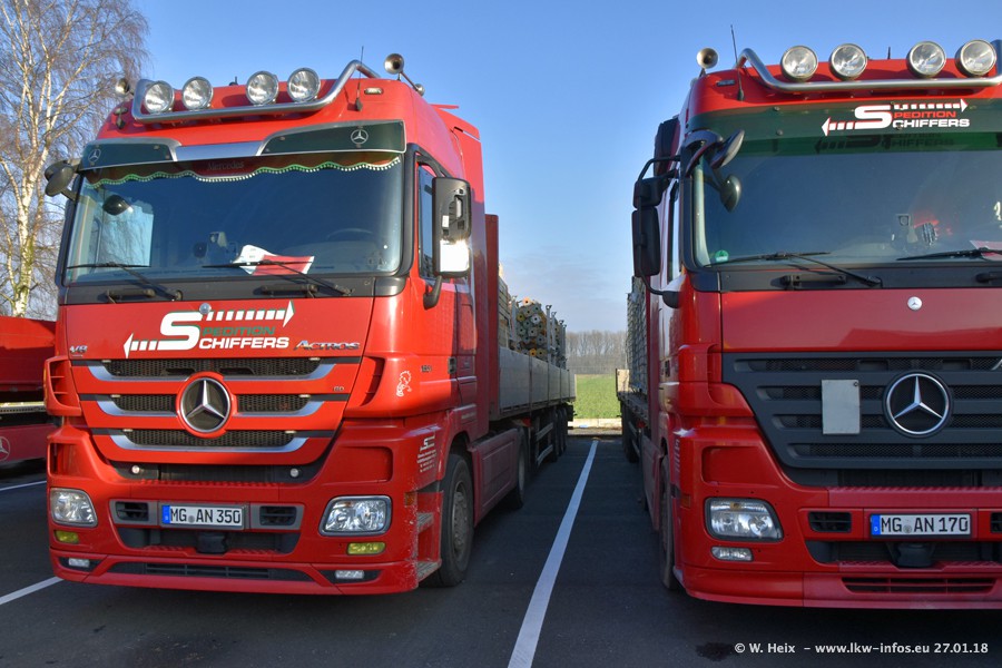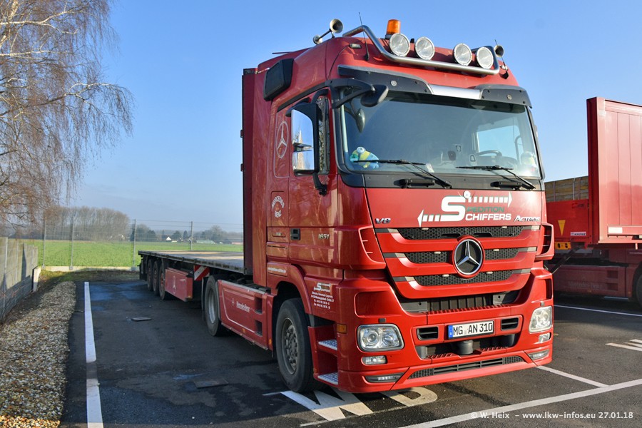 Heute war ich zum ersten Mal bei Schiffers in Mönchengladbach. Es gibt insgesamt 28 LKW, alle von Mercedes-Benz. Im Fernverkehr sind überwiegend Actros 4 im Einsatz. Im Nahverkehr werden überwiegend Mercedes-Benz der Baureihen Actros MP2 und Actros 3 eingesetzt.