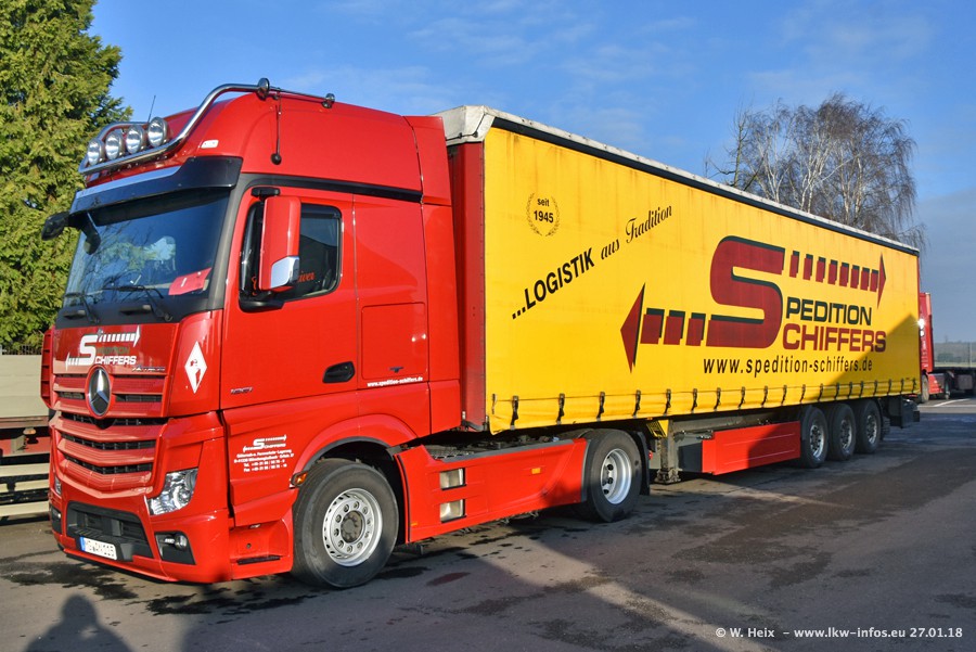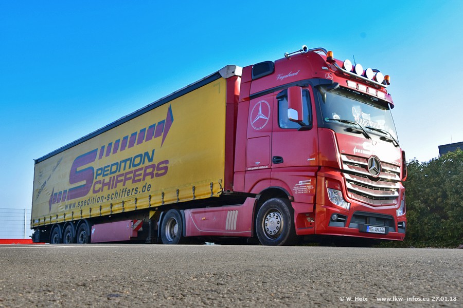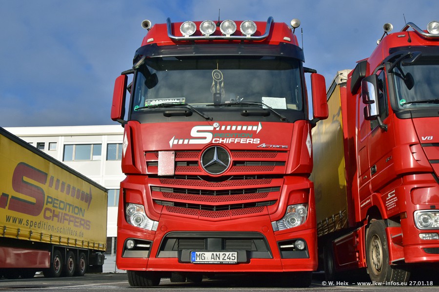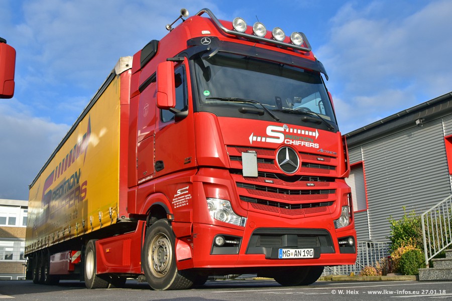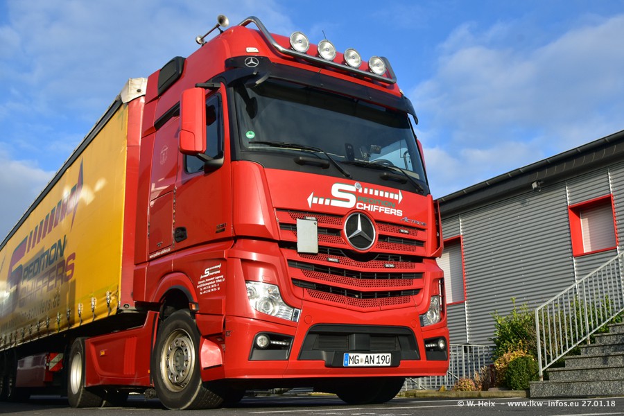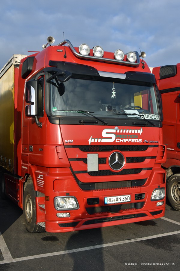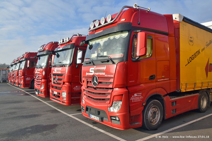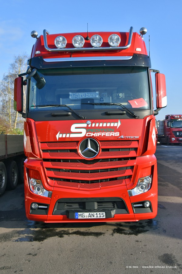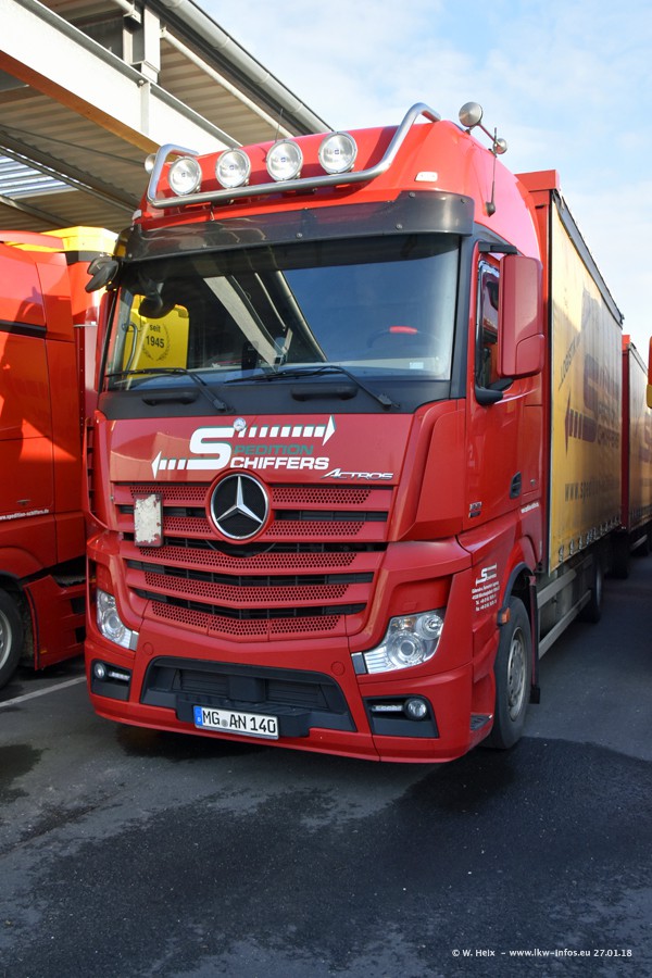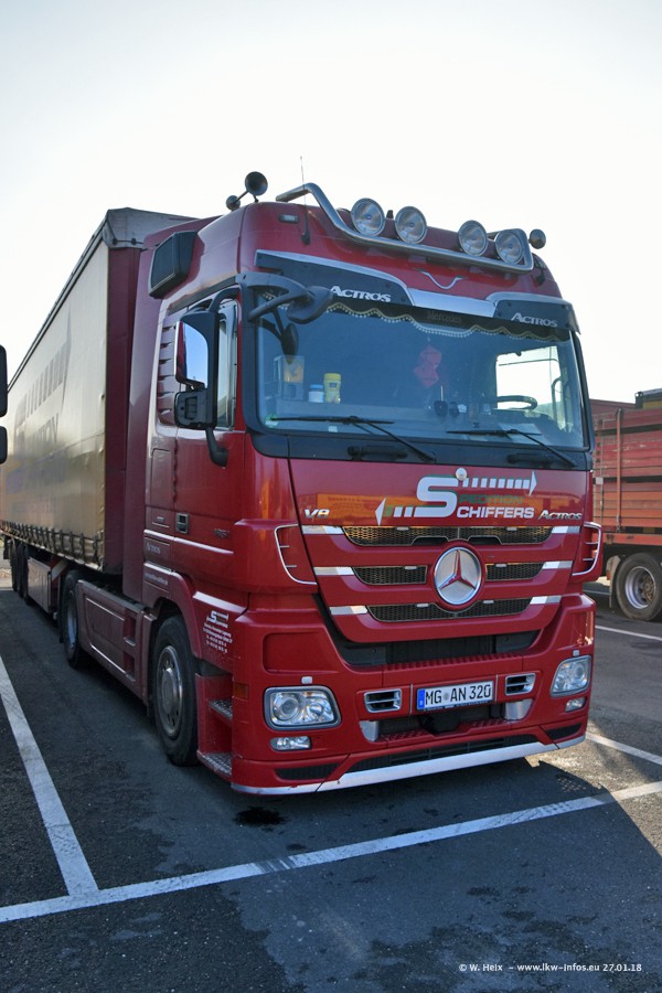 Heute war ich zum ersten Mal bei Schiffers in Mönchengladbach. Es gibt insgesamt 28 LKW, alle von Mercedes-Benz. Im Fernverkehr sind überwiegend Actros 4 im Einsatz. Im Nahverkehr werden überwiegend Mercedes-Benz der Baureihen Actros MP2 und Actros 3 eingesetzt.