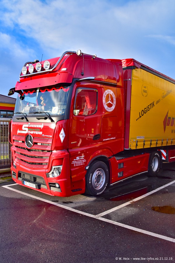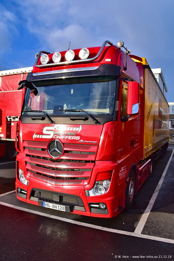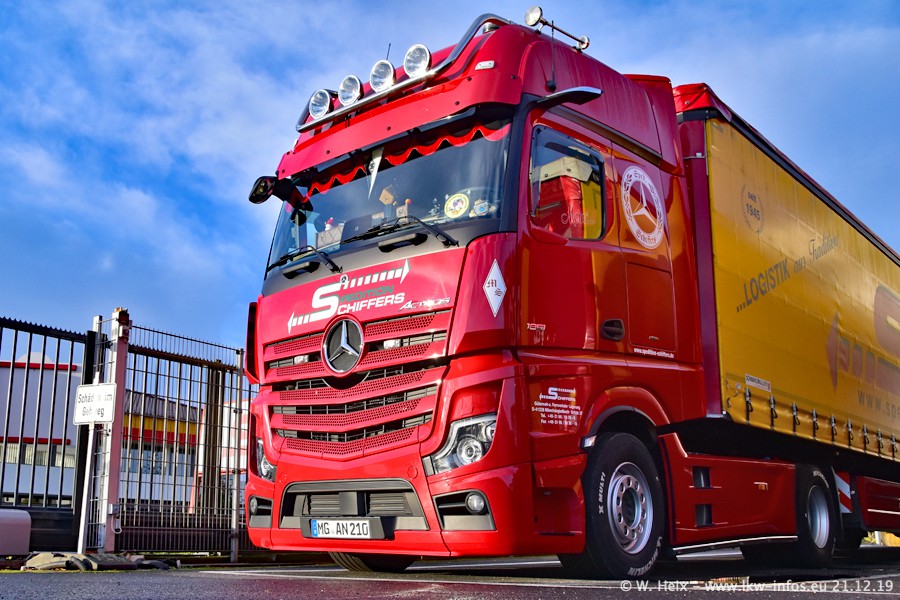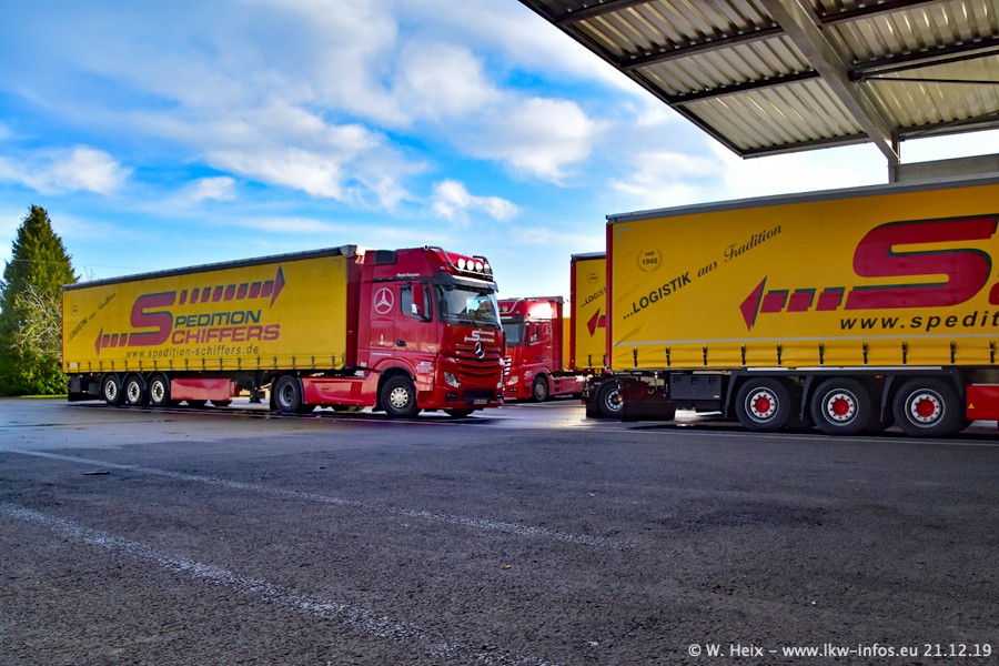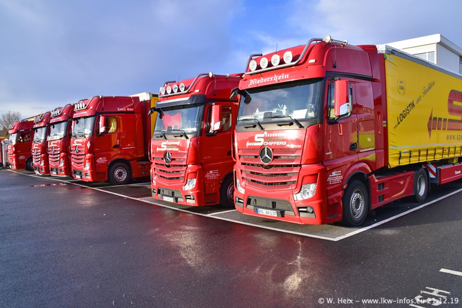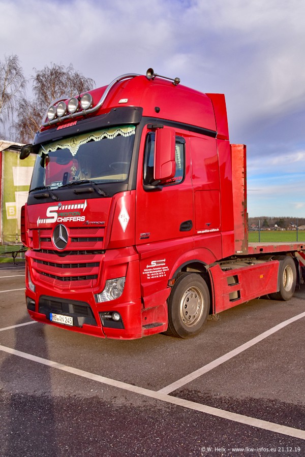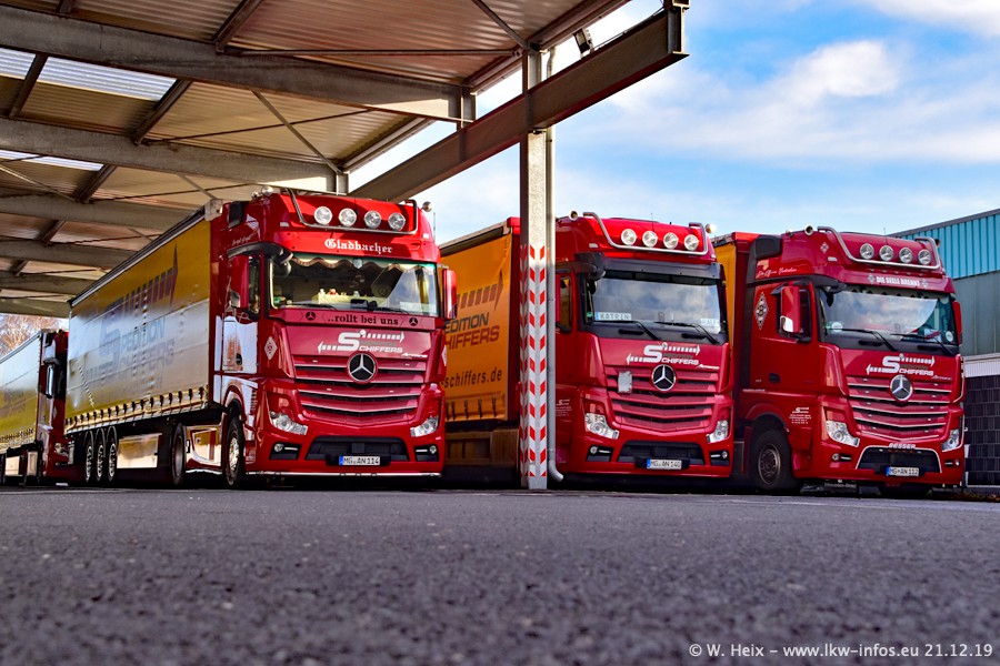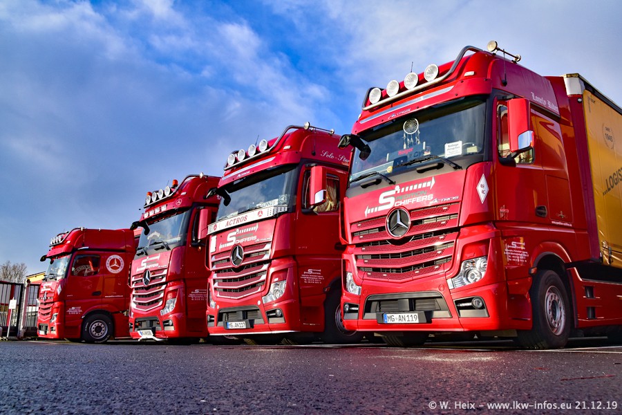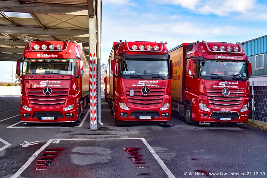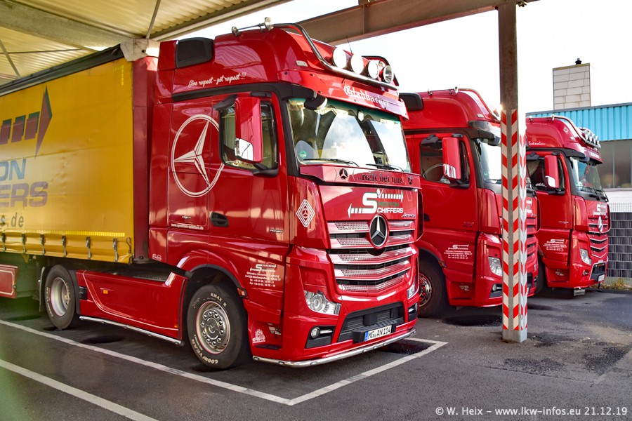 Dies war mein erster "Weihnachtsbesuch" bei Schiffers. Da die Feiertage in diesem Jahr so fallen, dass nur noch der Montag (23.12.) ein Arbeistag ist, haben schon viele Firmen ab dem 21.12. ihren Weihnachtsurlaub und bis Anfang Januar geschlossen. Und entsprechend hatte ich Glück, denn der gesamte Fuhrpark ist über Weihnachten zuhause in Mönchengladbach. Es gibt seit einigen Wochen den ersten Mercedes-Benz New Actros 4 (ohne Spiegel) im Fuhrpark. Der nächste kommt Anfang 2020.
