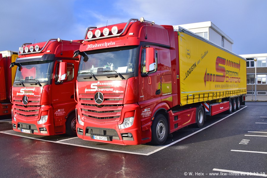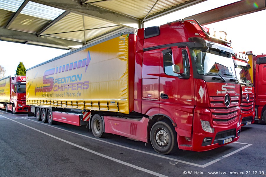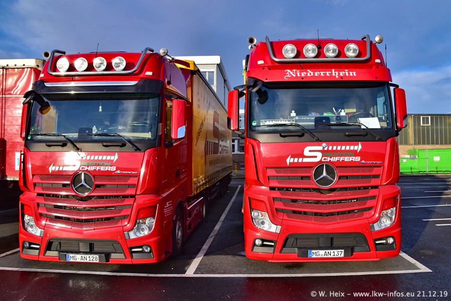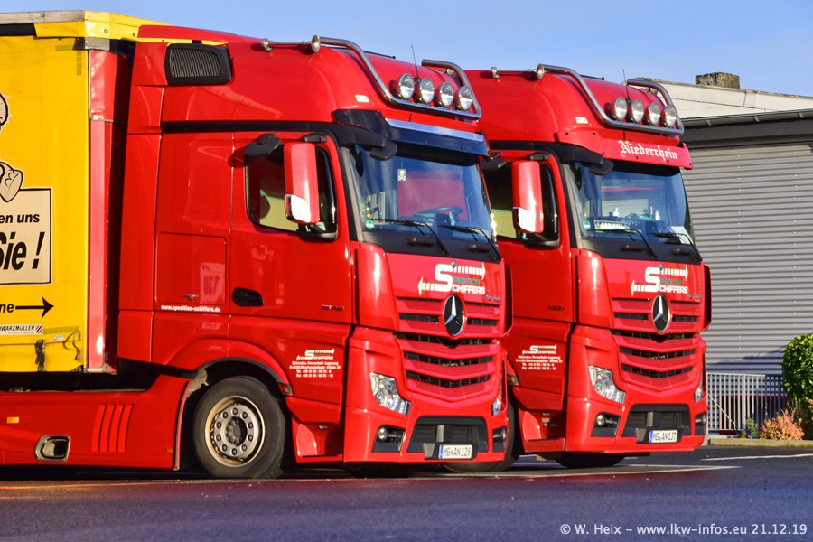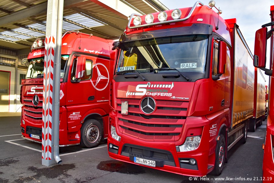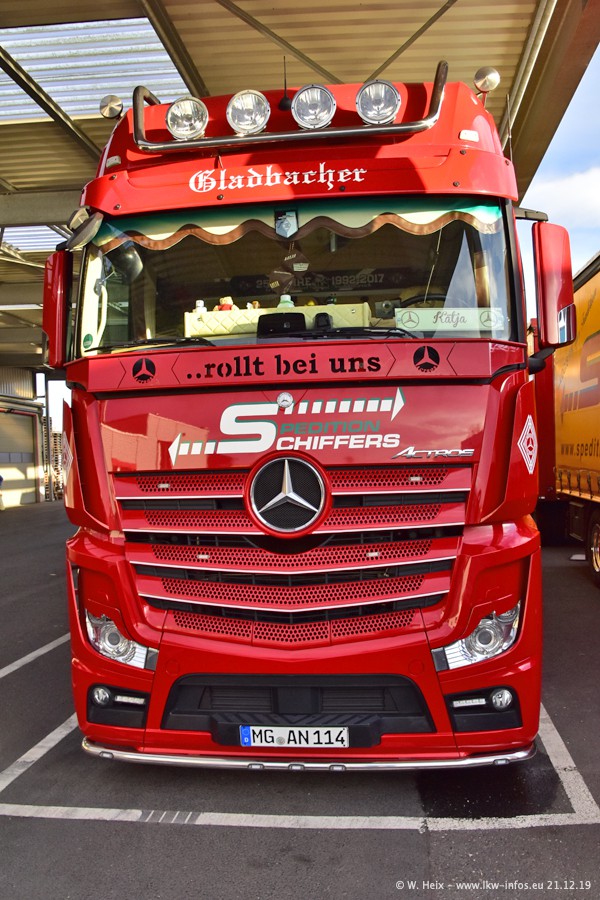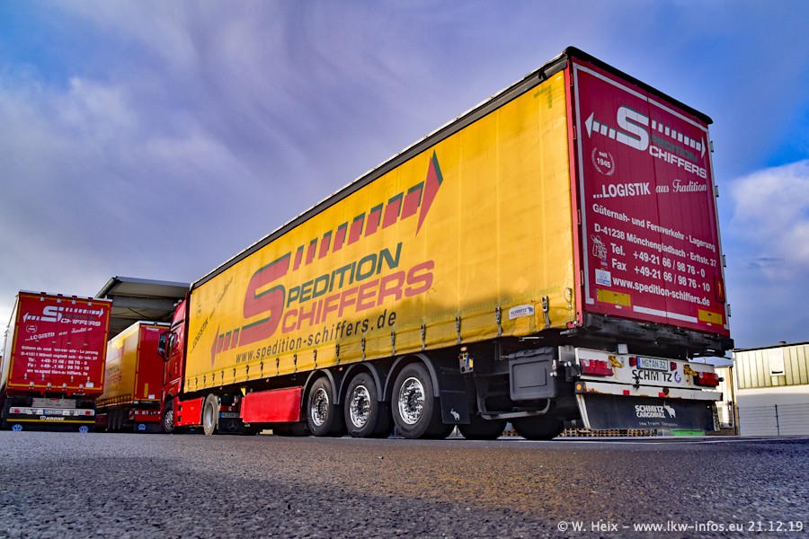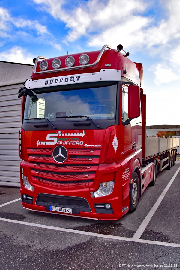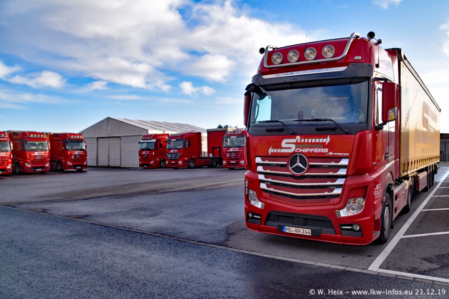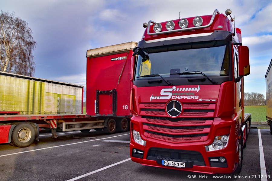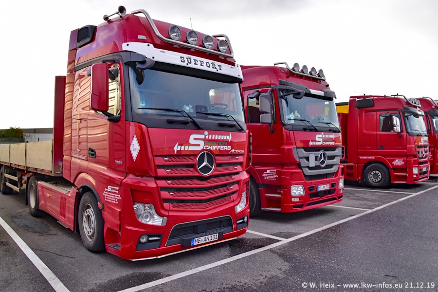 Dies war mein erster "Weihnachtsbesuch" bei Schiffers. Da die Feiertage in diesem Jahr so fallen, dass nur noch der Montag (23.12.) ein Arbeistag ist, haben schon viele Firmen ab dem 21.12. ihren Weihnachtsurlaub und bis Anfang Januar geschlossen. Und entsprechend hatte ich Glück, denn der gesamte Fuhrpark ist über Weihnachten zuhause in Mönchengladbach. Es gibt seit einigen Wochen den ersten Mercedes-Benz New Actros 4 (ohne Spiegel) im Fuhrpark. Der nächste kommt Anfang 2020.
