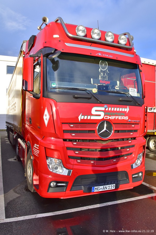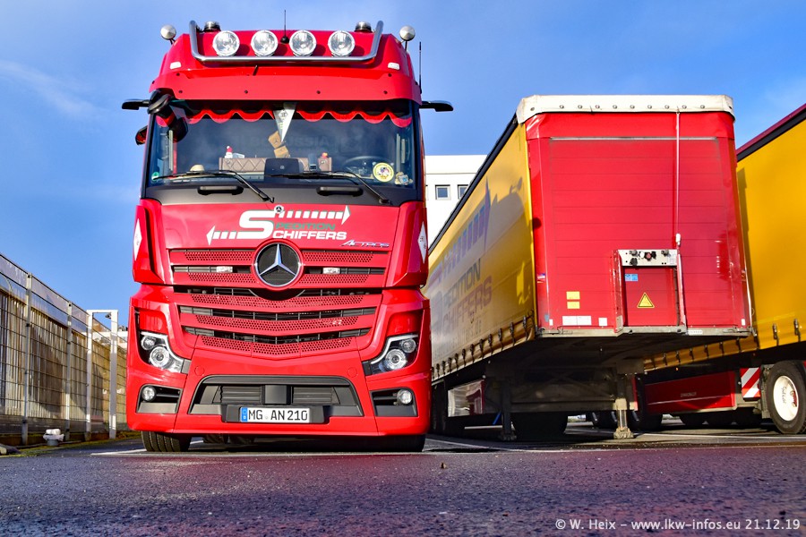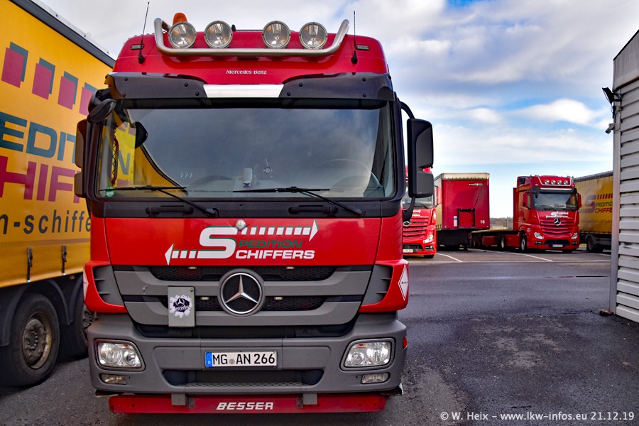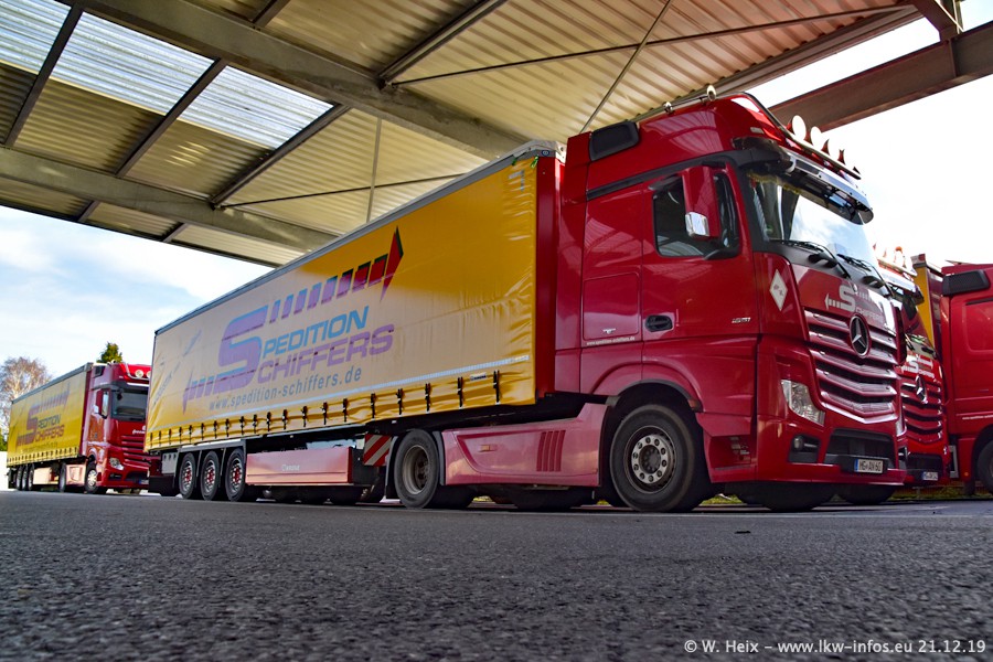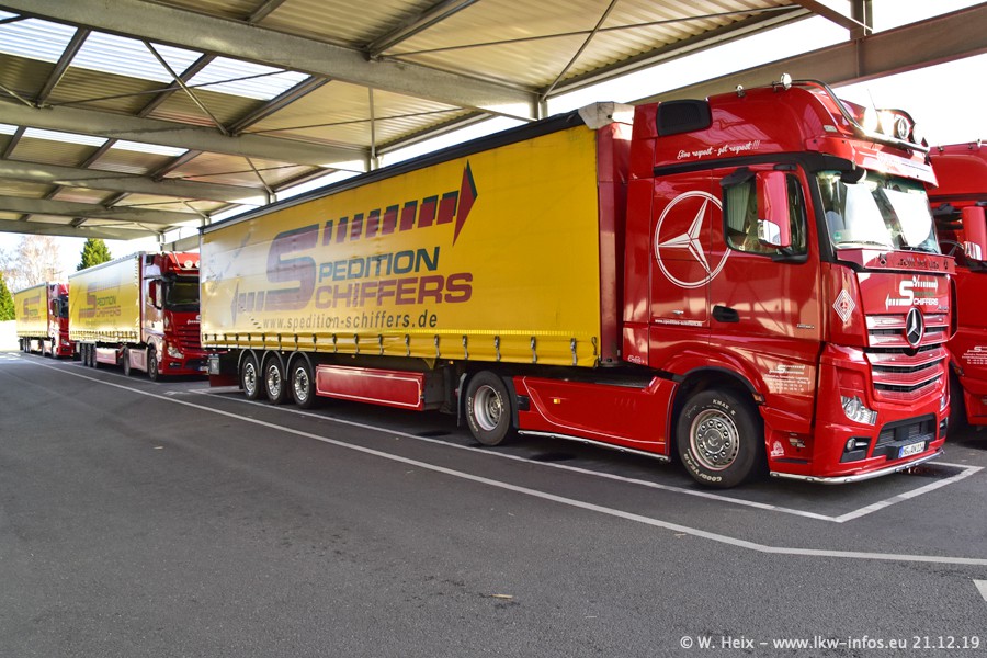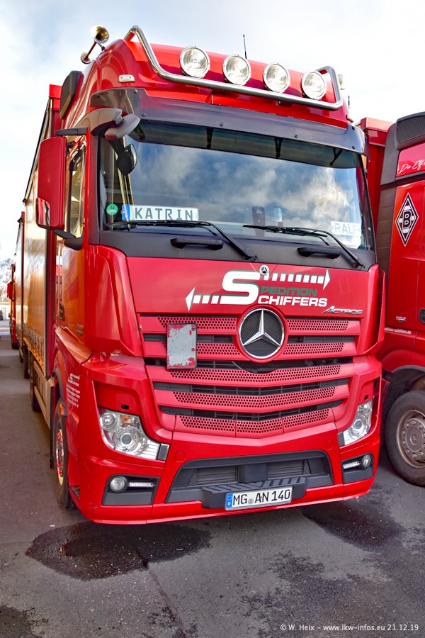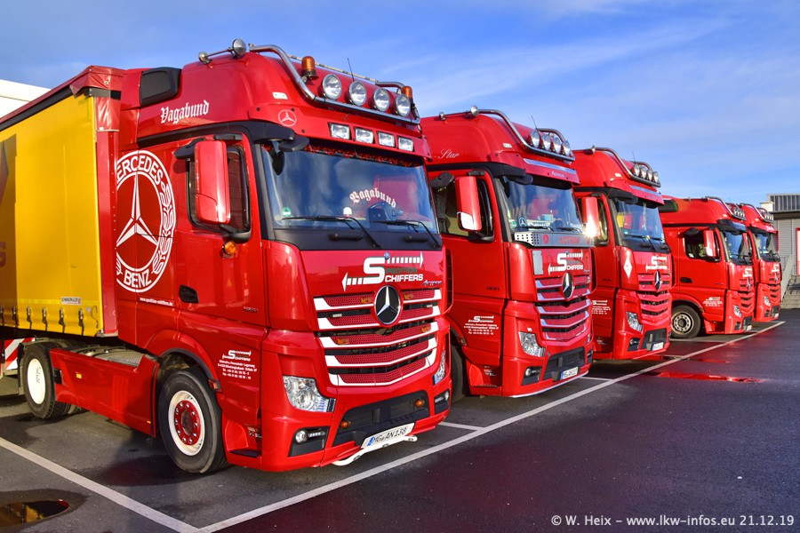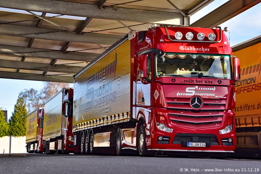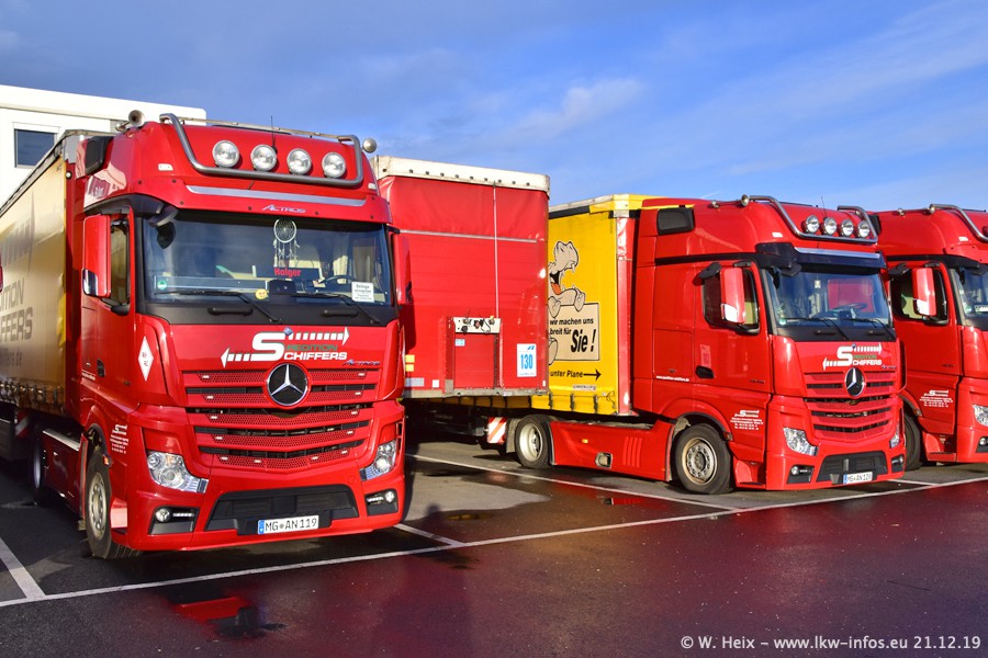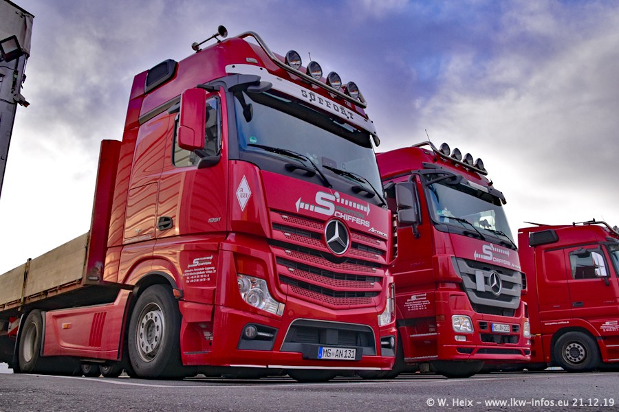 Dies war mein erster "Weihnachtsbesuch" bei Schiffers. Da die Feiertage in diesem Jahr so fallen, dass nur noch der Montag (23.12.) ein Arbeistag ist, haben schon viele Firmen ab dem 21.12. ihren Weihnachtsurlaub und bis Anfang Januar geschlossen. Und entsprechend hatte ich Glück, denn der gesamte Fuhrpark ist über Weihnachten zuhause in Mönchengladbach. Es gibt seit einigen Wochen den ersten Mercedes-Benz New Actros 4 (ohne Spiegel) im Fuhrpark. Der nächste kommt Anfang 2020.