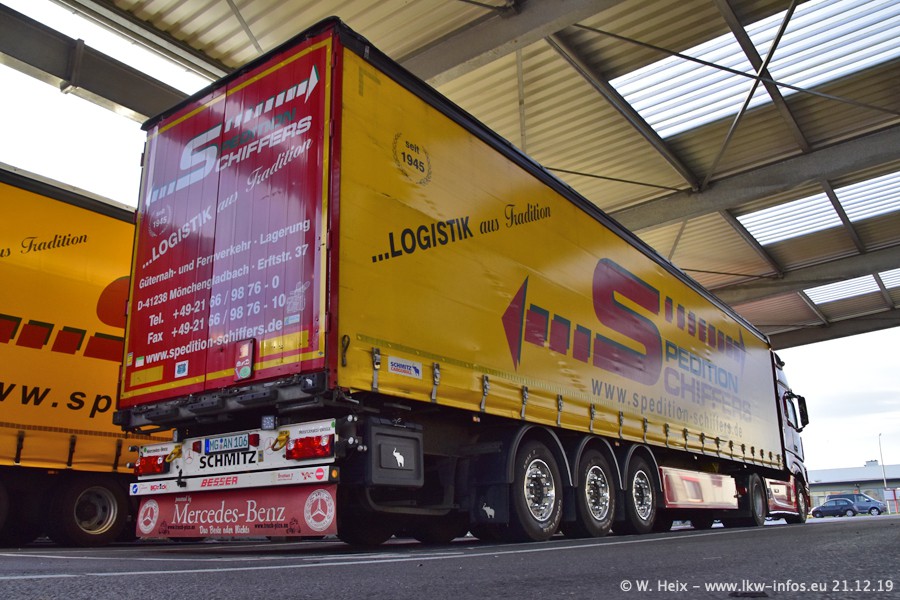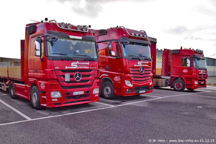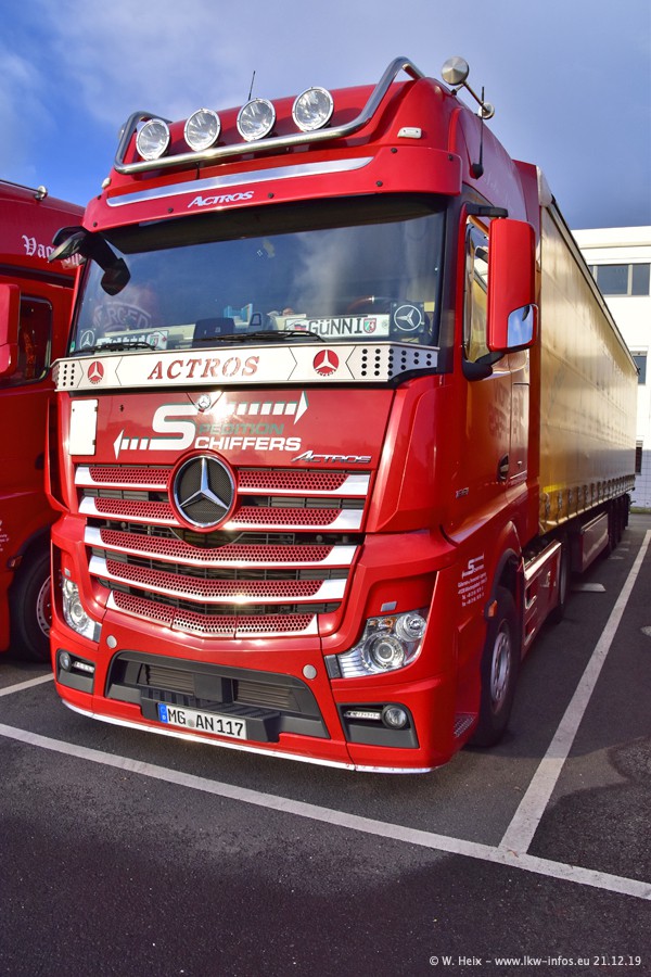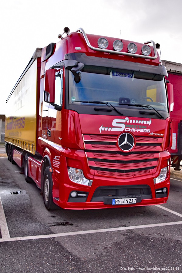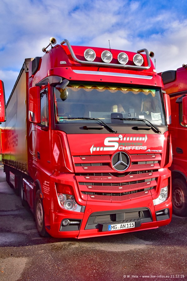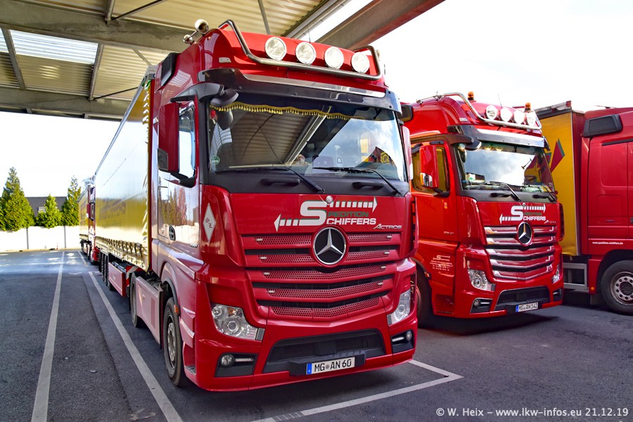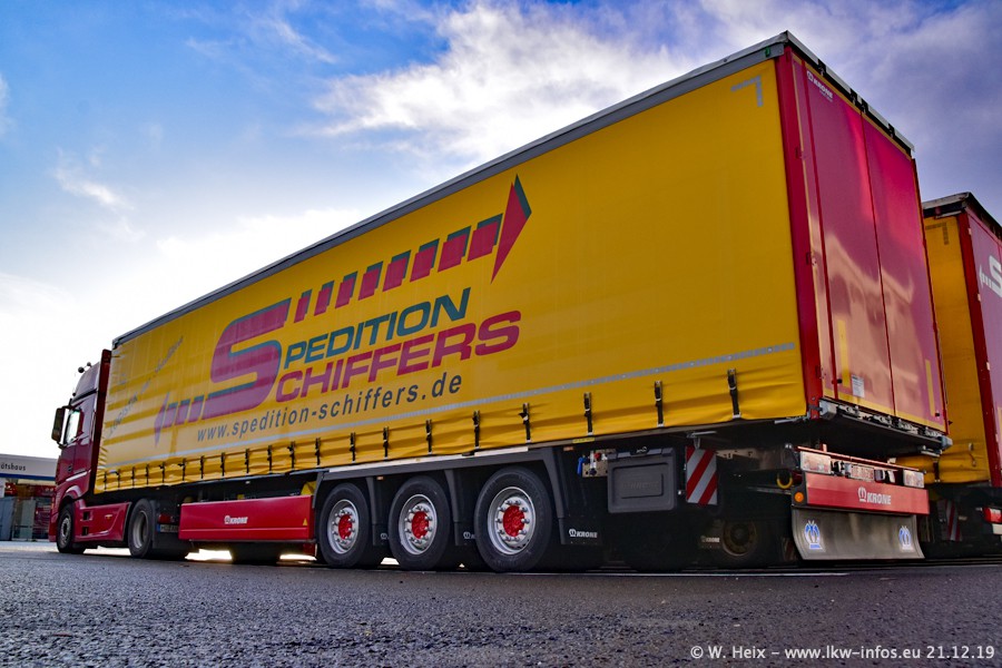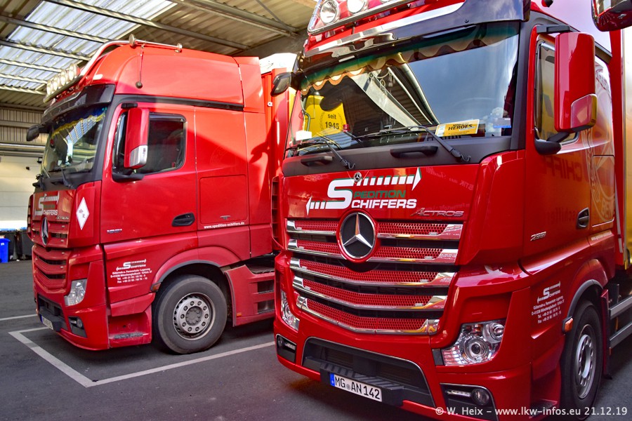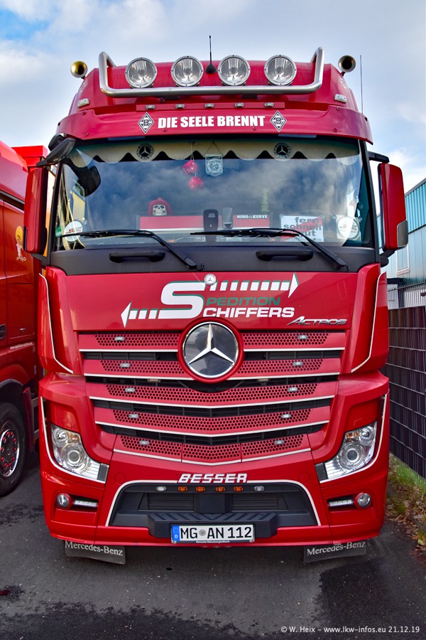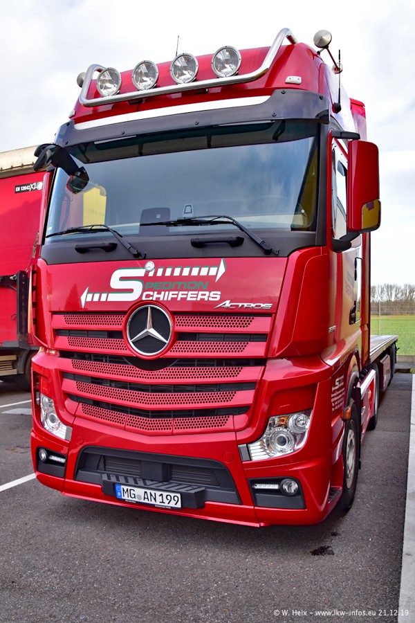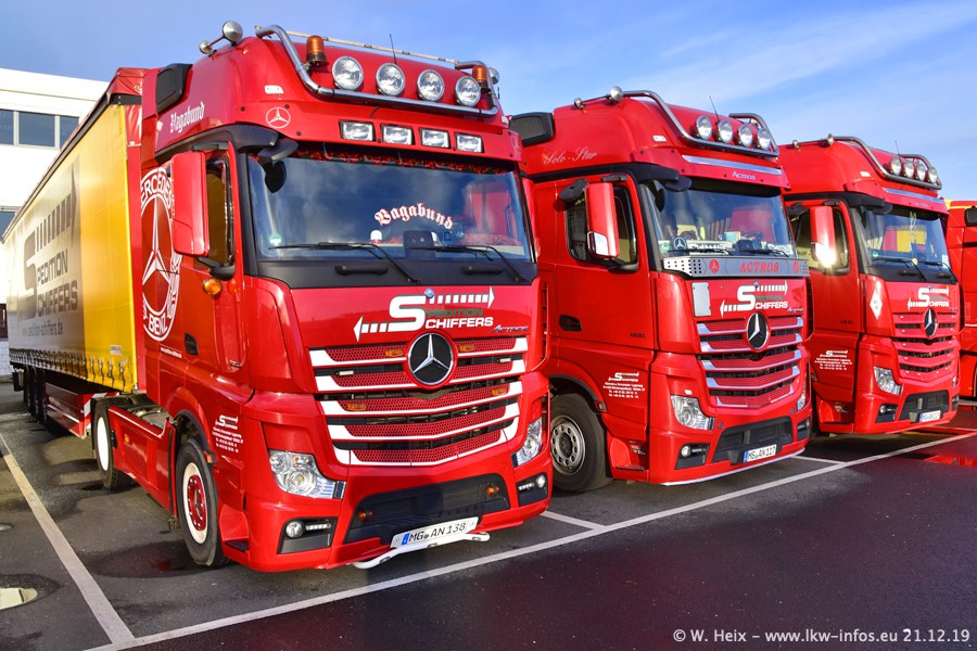 Dies war mein erster "Weihnachtsbesuch" bei Schiffers. Da die Feiertage in diesem Jahr so fallen, dass nur noch der Montag (23.12.) ein Arbeistag ist, haben schon viele Firmen ab dem 21.12. ihren Weihnachtsurlaub und bis Anfang Januar geschlossen. Und entsprechend hatte ich Glück, denn der gesamte Fuhrpark ist über Weihnachten zuhause in Mönchengladbach. Es gibt seit einigen Wochen den ersten Mercedes-Benz New Actros 4 (ohne Spiegel) im Fuhrpark. Der nächste kommt Anfang 2020.