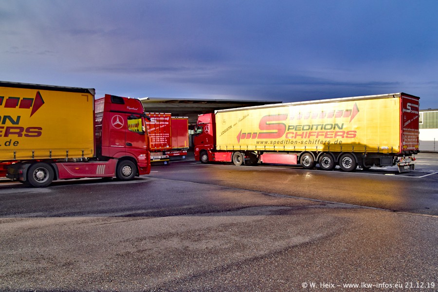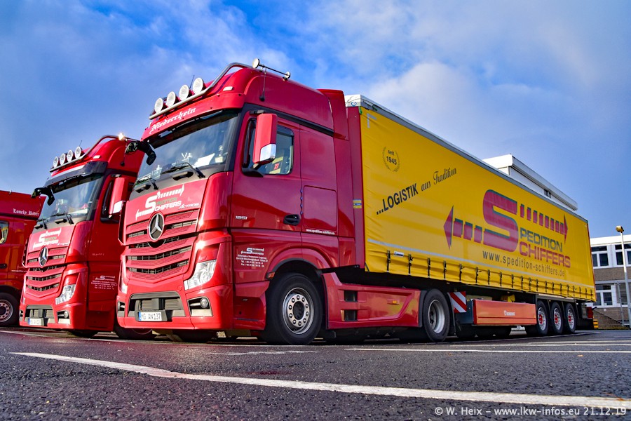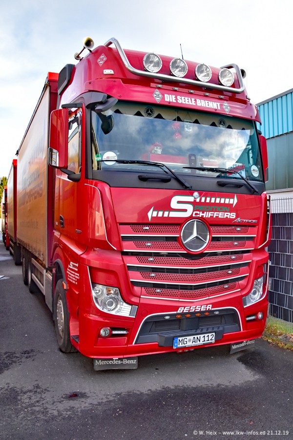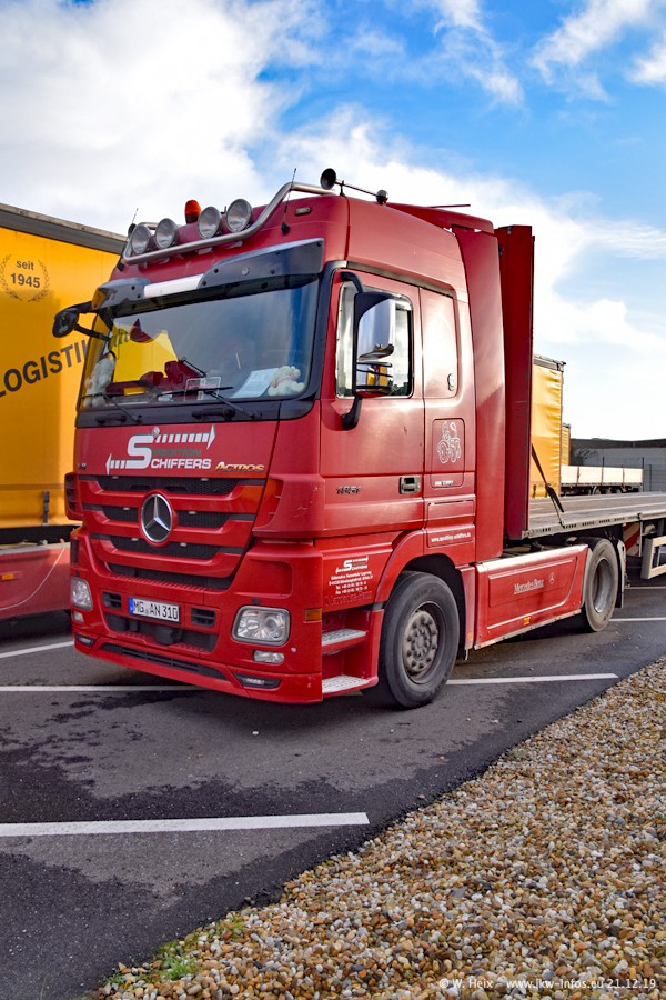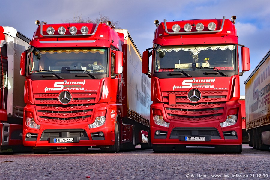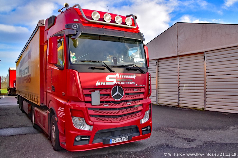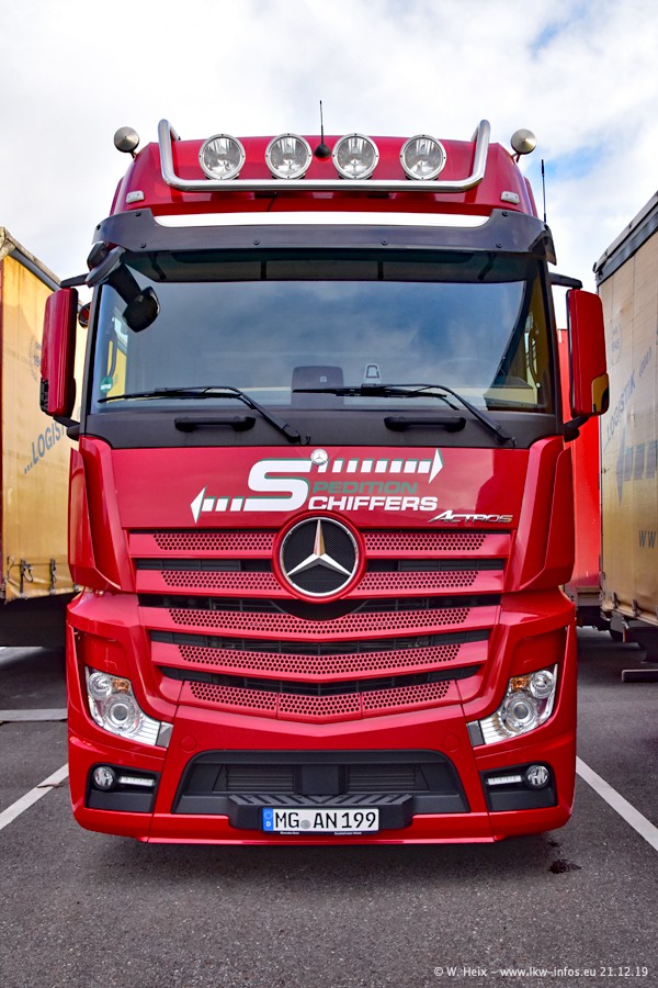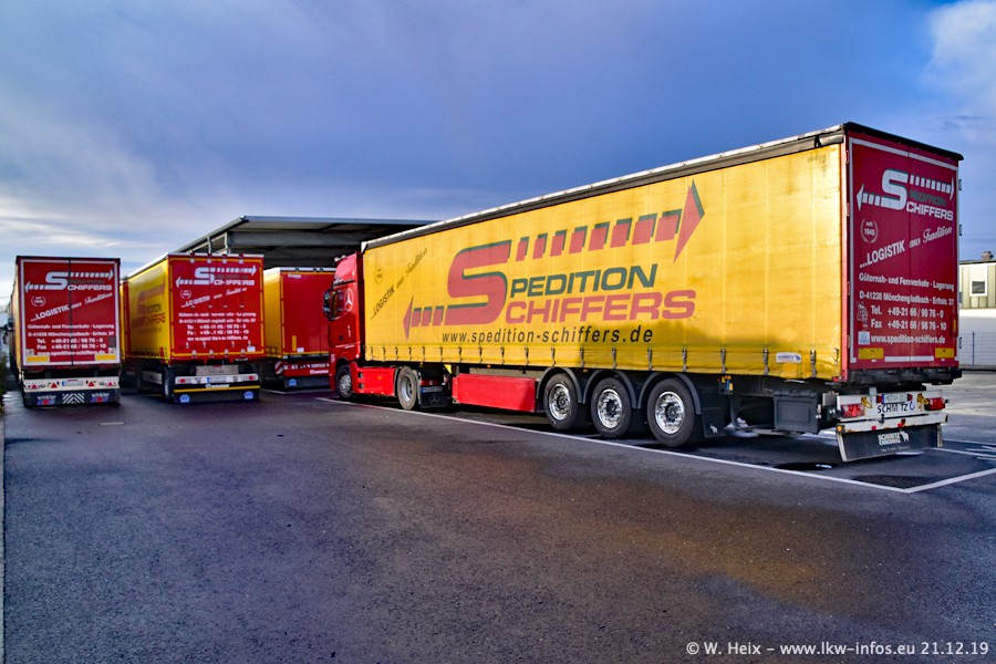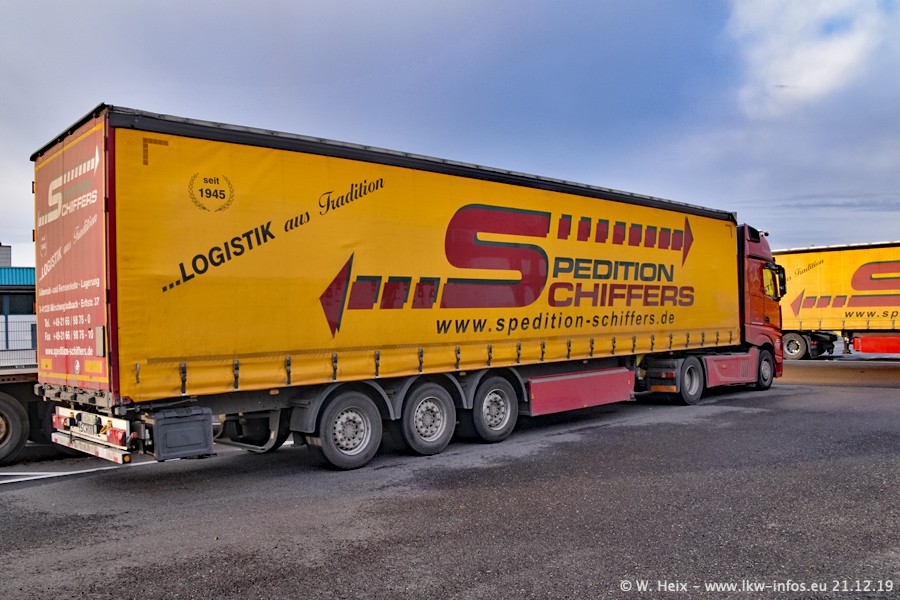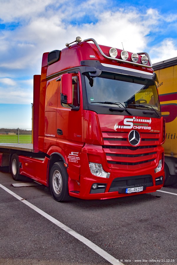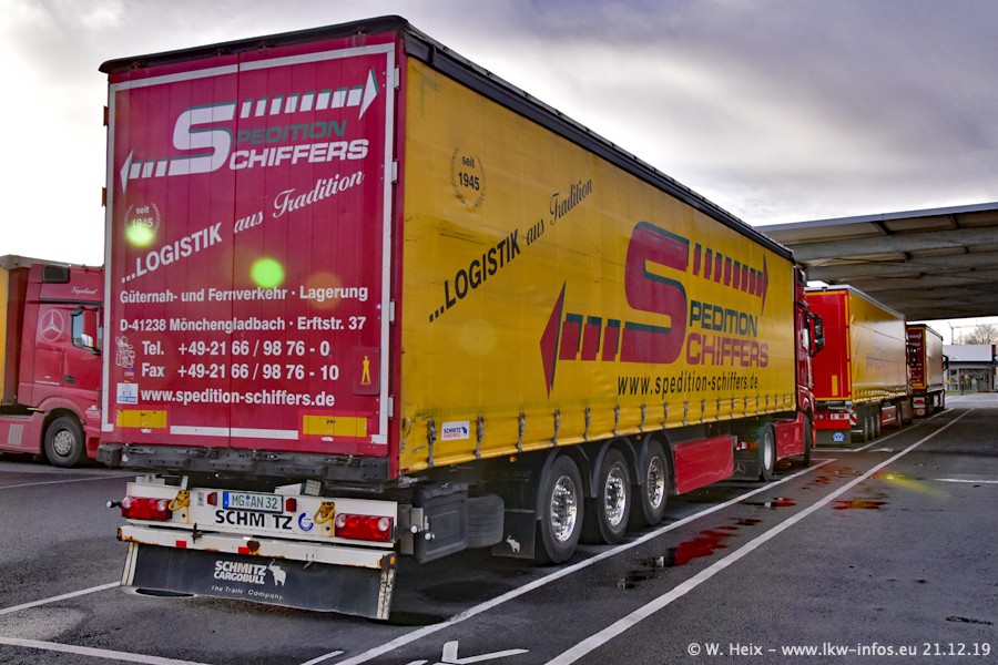 Dies war mein erster "Weihnachtsbesuch" bei Schiffers. Da die Feiertage in diesem Jahr so fallen, dass nur noch der Montag (23.12.) ein Arbeistag ist, haben schon viele Firmen ab dem 21.12. ihren Weihnachtsurlaub und bis Anfang Januar geschlossen. Und entsprechend hatte ich Glück, denn der gesamte Fuhrpark ist über Weihnachten zuhause in Mönchengladbach. Es gibt seit einigen Wochen den ersten Mercedes-Benz New Actros 4 (ohne Spiegel) im Fuhrpark. Der nächste kommt Anfang 2020.