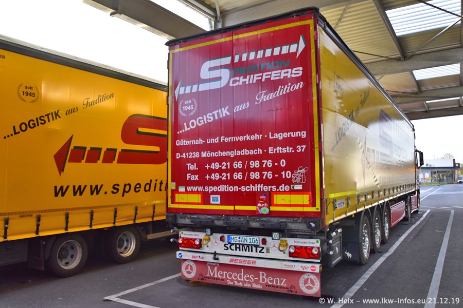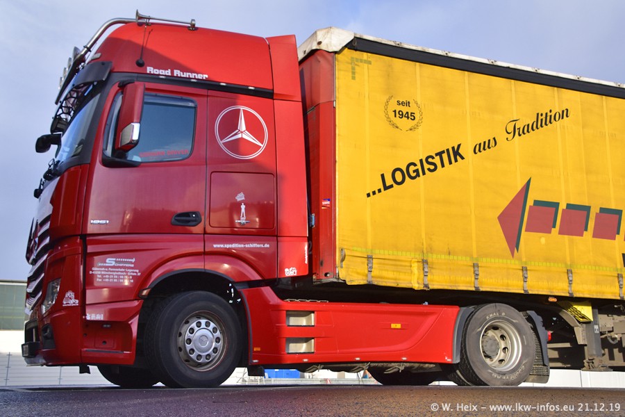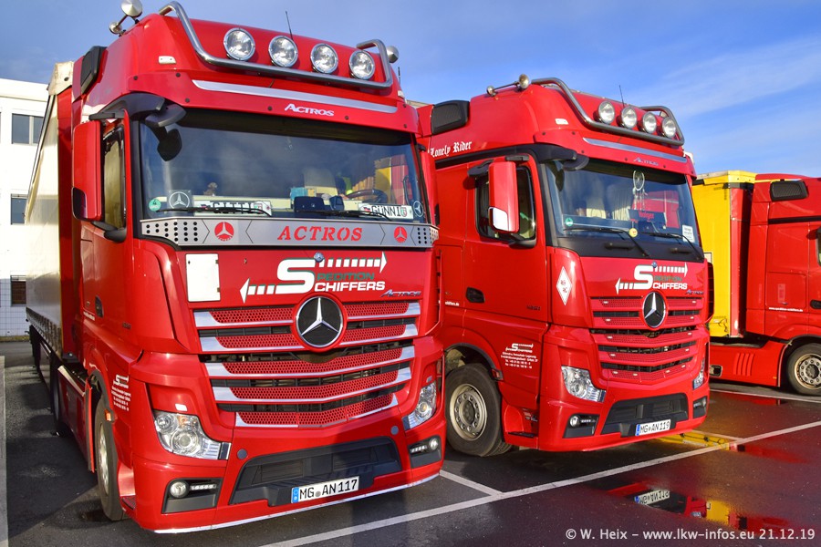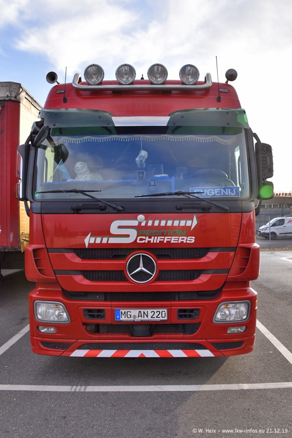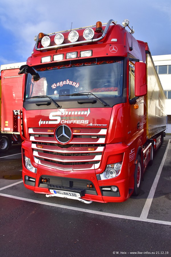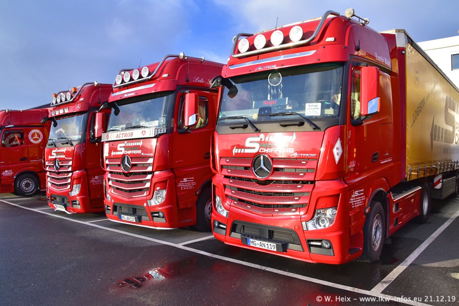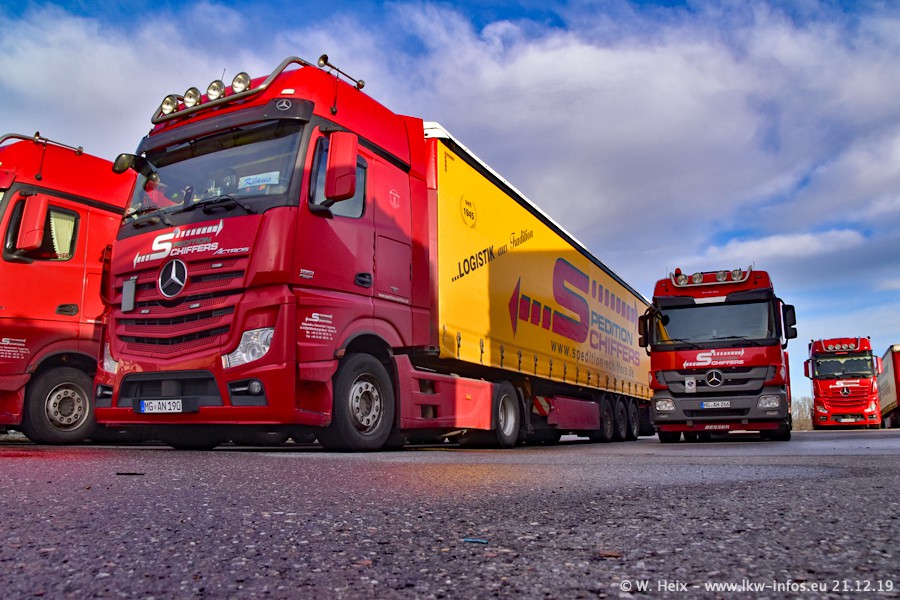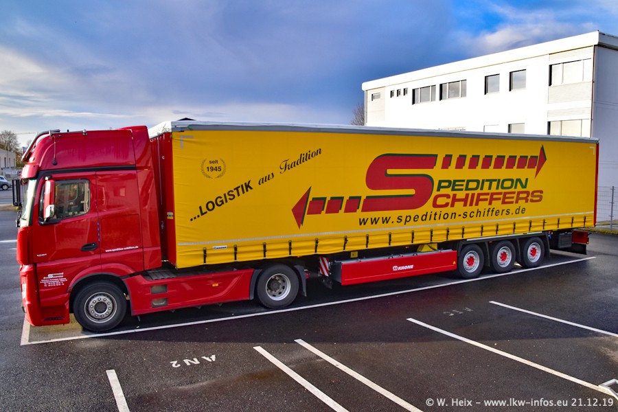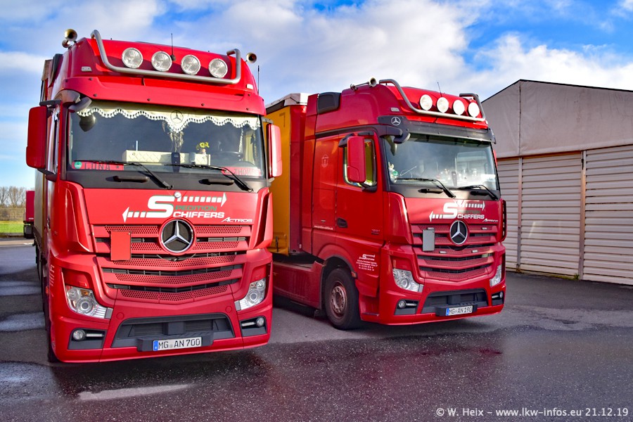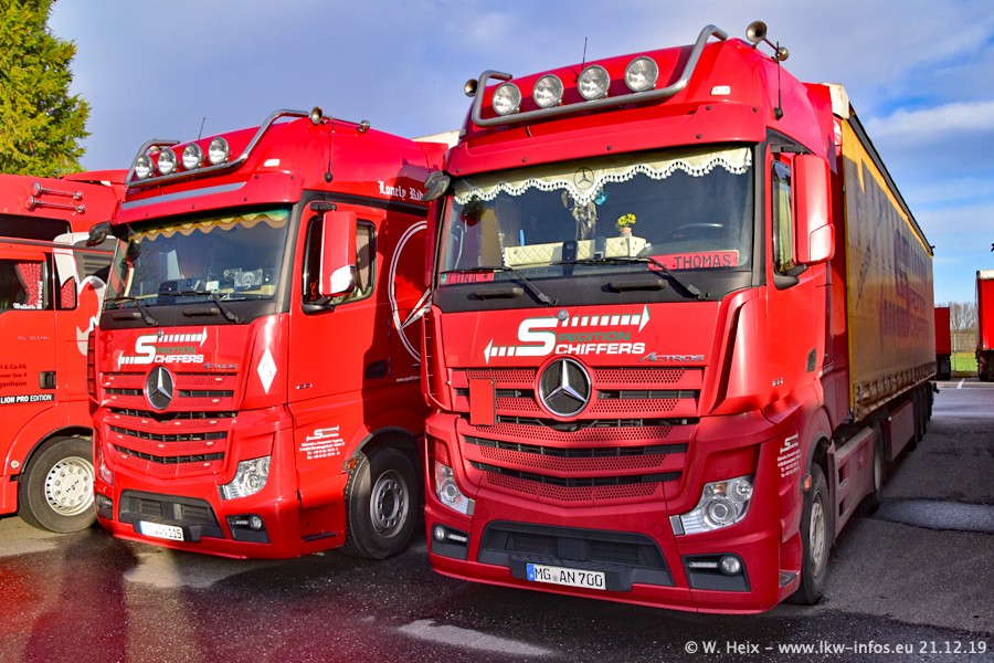 Dies war mein erster "Weihnachtsbesuch" bei Schiffers. Da die Feiertage in diesem Jahr so fallen, dass nur noch der Montag (23.12.) ein Arbeistag ist, haben schon viele Firmen ab dem 21.12. ihren Weihnachtsurlaub und bis Anfang Januar geschlossen. Und entsprechend hatte ich Glück, denn der gesamte Fuhrpark ist über Weihnachten zuhause in Mönchengladbach. Es gibt seit einigen Wochen den ersten Mercedes-Benz New Actros 4 (ohne Spiegel) im Fuhrpark. Der nächste kommt Anfang 2020.