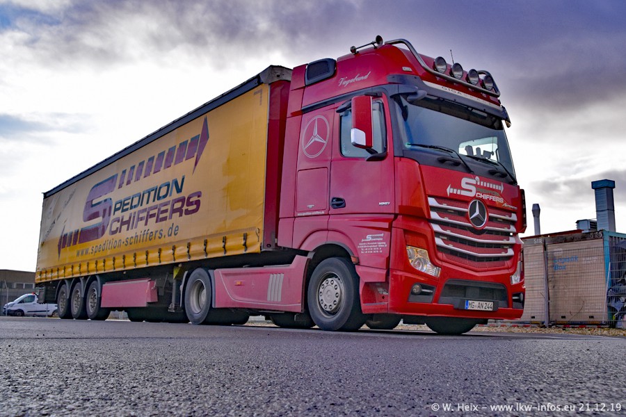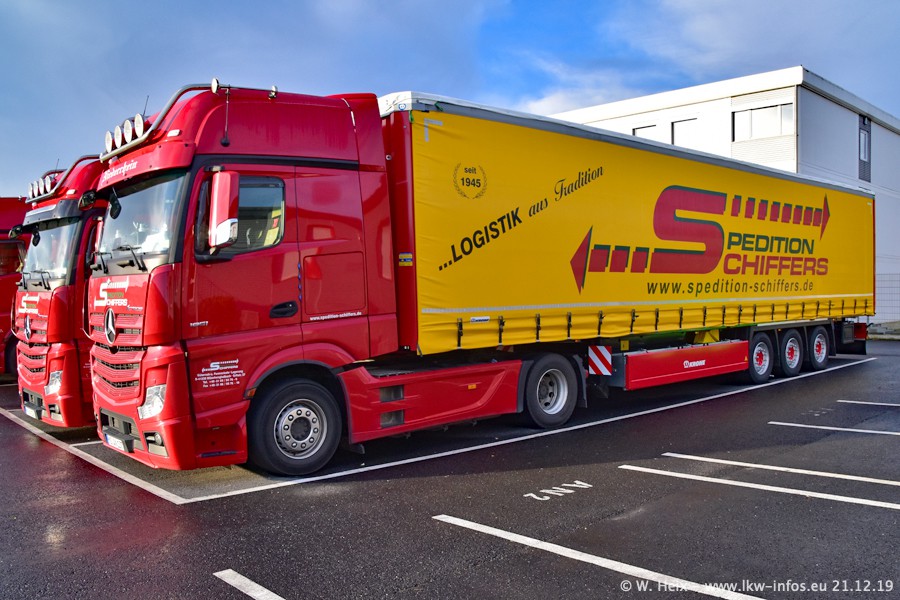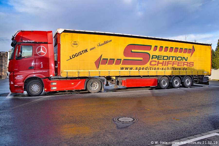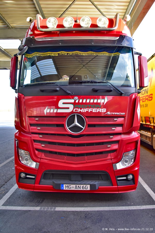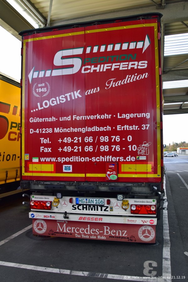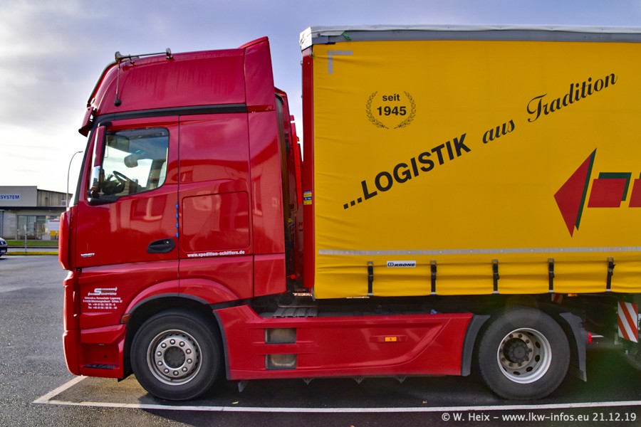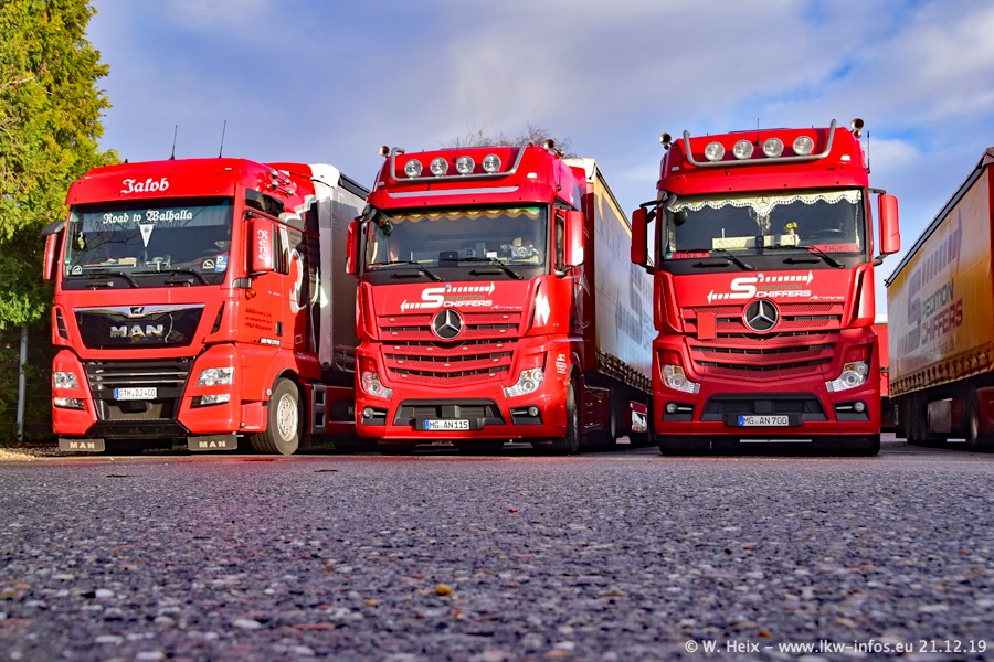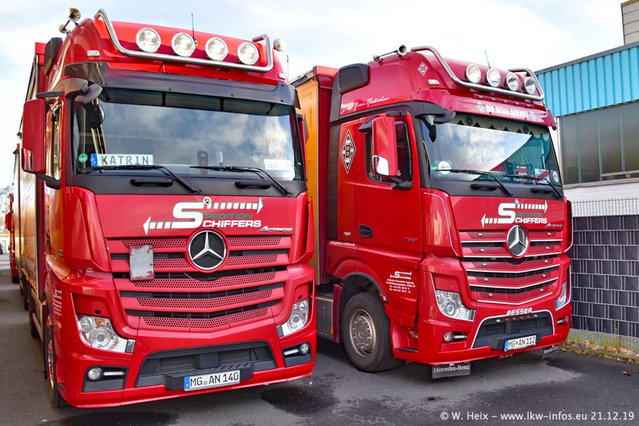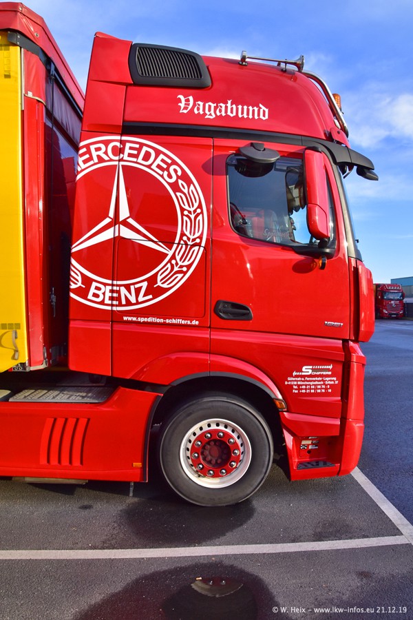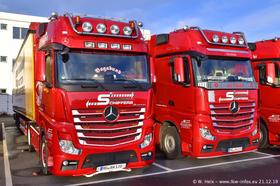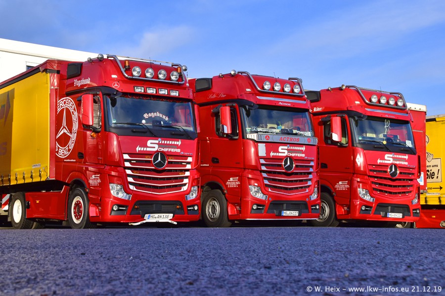 Dies war mein erster "Weihnachtsbesuch" bei Schiffers. Da die Feiertage in diesem Jahr so fallen, dass nur noch der Montag (23.12.) ein Arbeistag ist, haben schon viele Firmen ab dem 21.12. ihren Weihnachtsurlaub und bis Anfang Januar geschlossen. Und entsprechend hatte ich Glück, denn der gesamte Fuhrpark ist über Weihnachten zuhause in Mönchengladbach. Es gibt seit einigen Wochen den ersten Mercedes-Benz New Actros 4 (ohne Spiegel) im Fuhrpark. Der nächste kommt Anfang 2020.