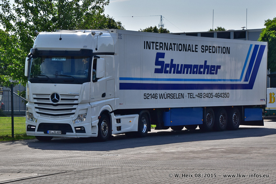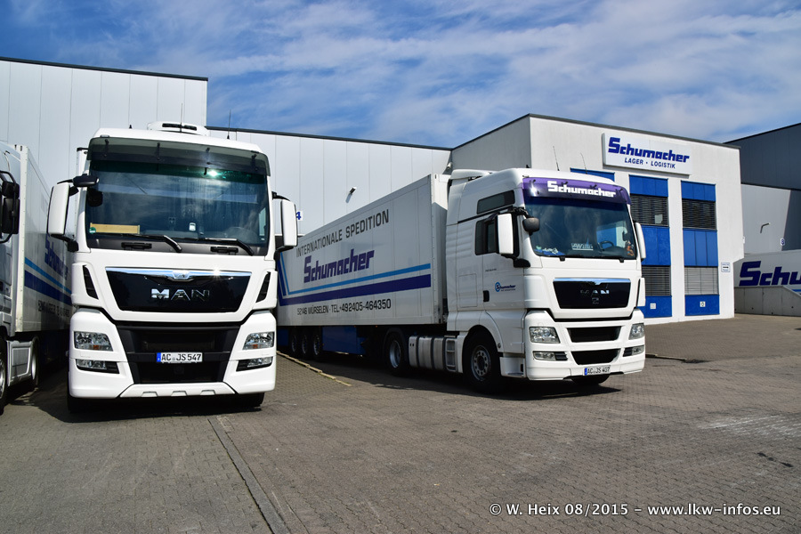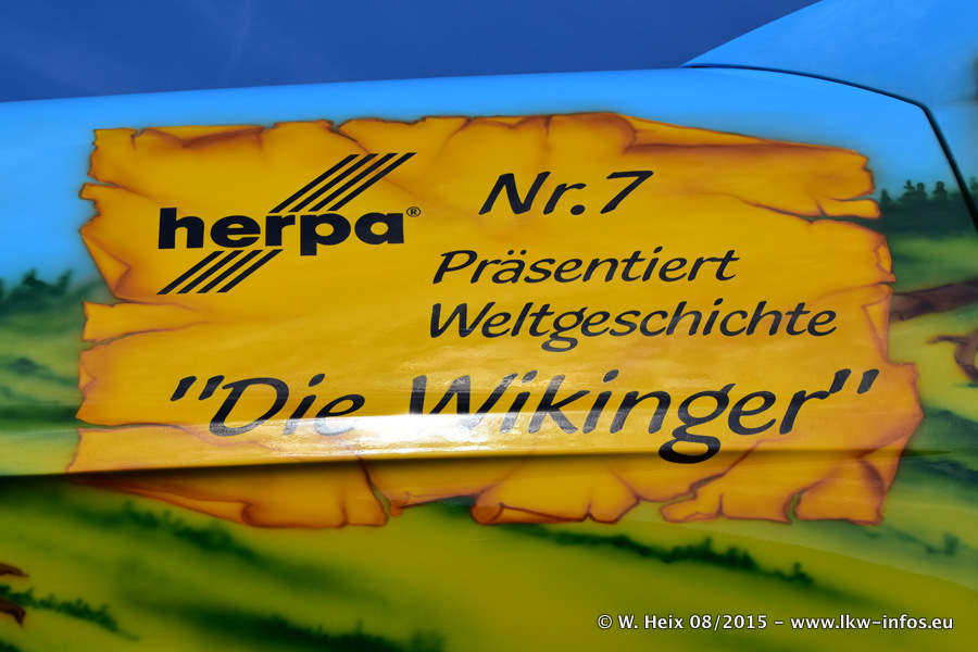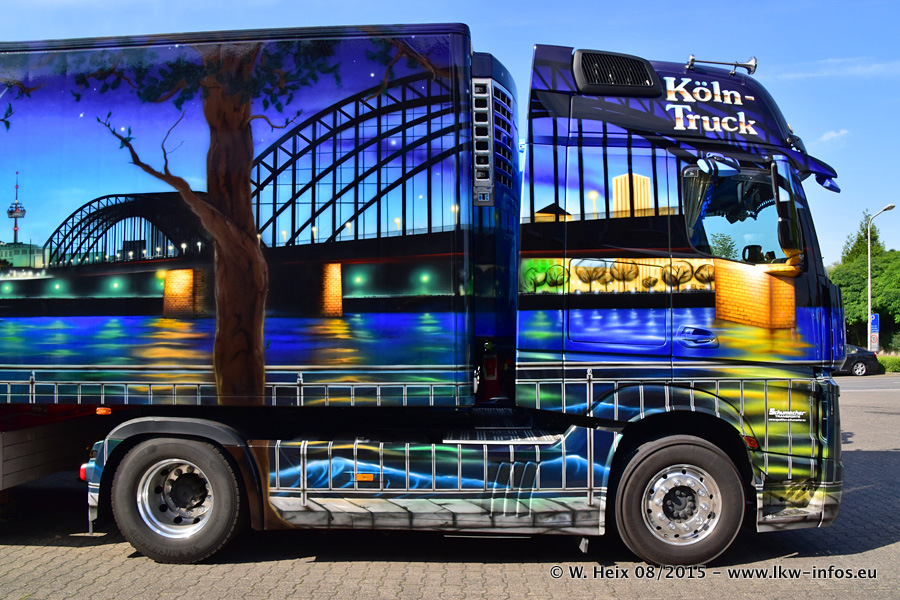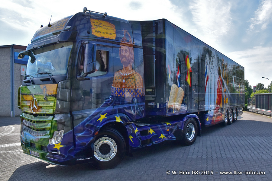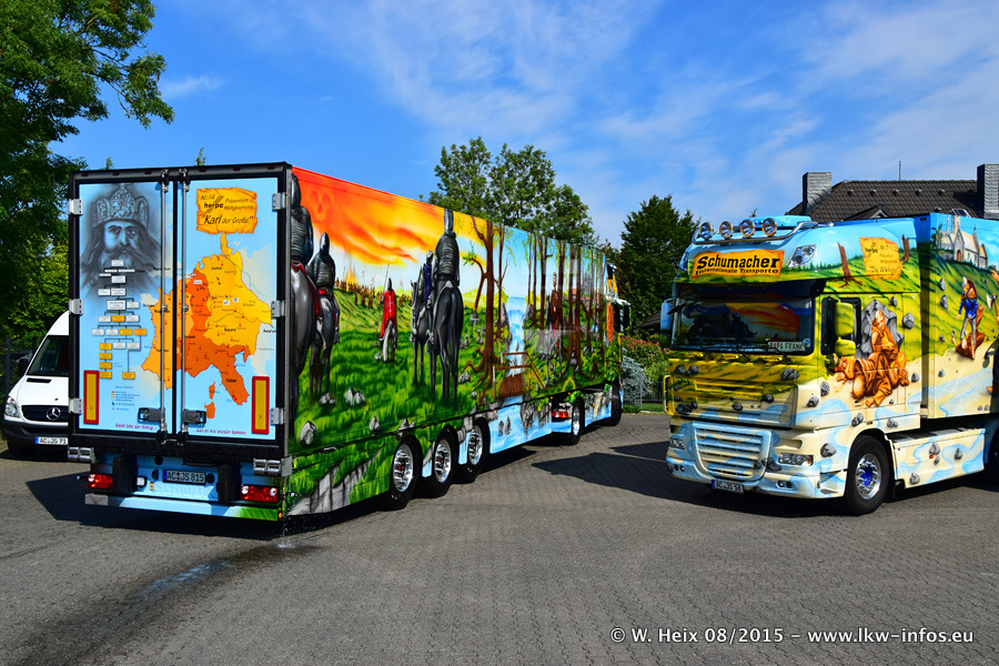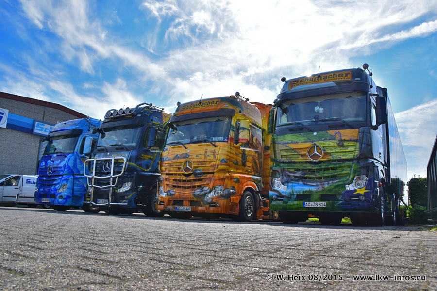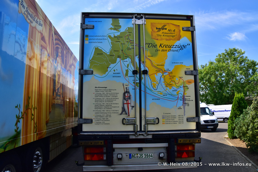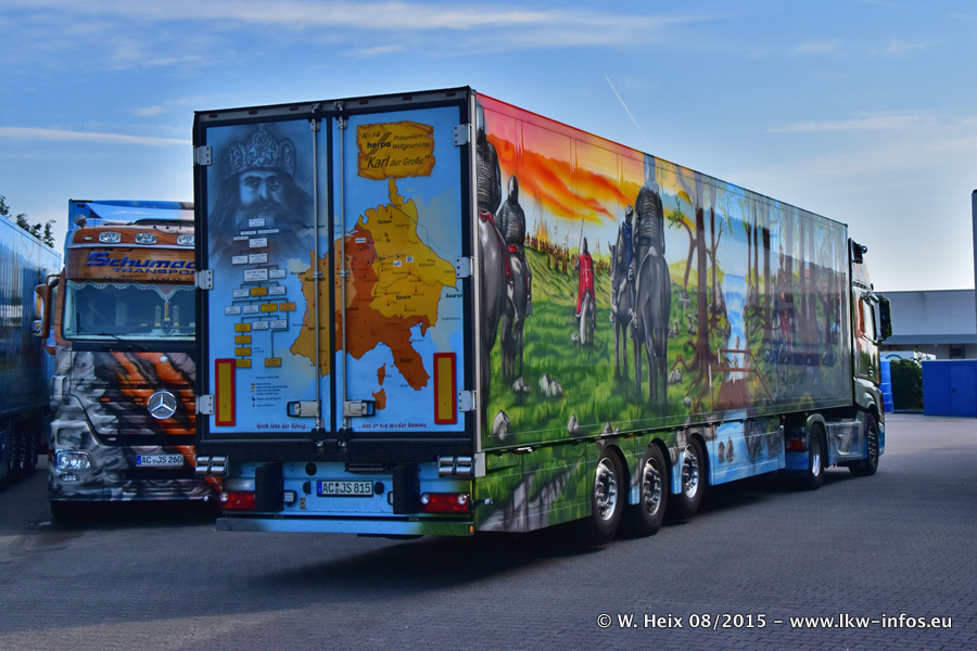 Bei diesem Besuch waren bis auf einen LKW alle Showtrucks der Herpa-Serie zuhause. Schumacher hat ja bekanntlich inzwischen den größten Teil dieser 14 Trucks im Fuhrpark. Die Nummer 1 bekam vor einigen Monaten eine neue Zugmaschine und läuft jetzt unter der Numer 1.1 "Die Wiege der Menschheit". Ende 2014 bekam Schumacher die Nummer 14 der Serie: "Herpa präsentiert Weltgeschichte Nr. 14 - Karl der Große". Das ist aktuell der letzte neue Showtruck der Herpa-Serie. Außerdem konnte ich diesmal den Köln-Truck von allen Seiten fotografieren, da dieser auch zuhause war. Danke an den/die Fahrer von Schumacher, die mir die Showtrucks zum Fotografieren auf dem Hof "ins richtige Licht" gerückt haben.